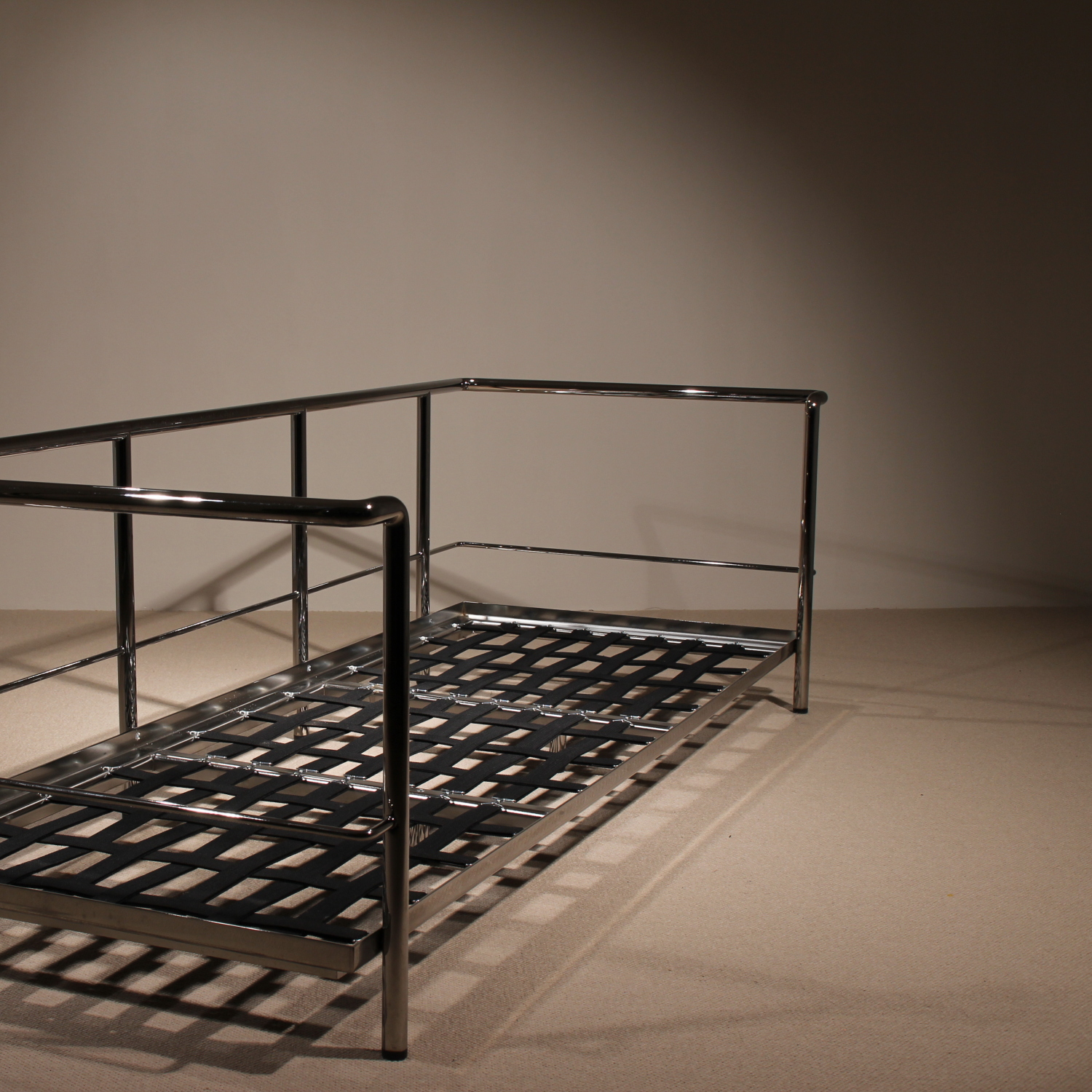 The sofa is in a very well-maintained condition. The leather shows only a few signs of wear with a subtle patina, and the chrome-plated frame presents a beautiful shine.