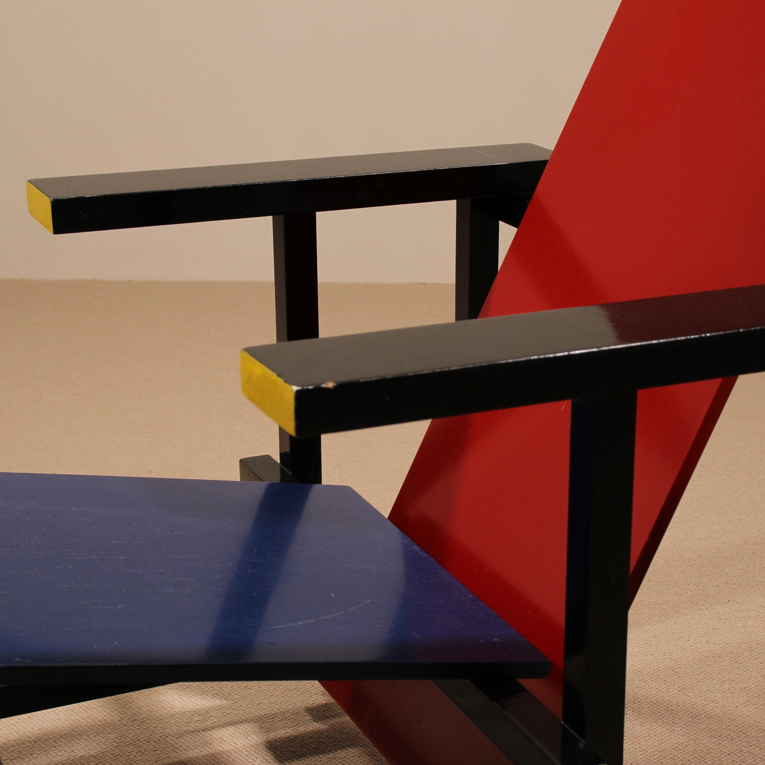 A modern icon: the Red and Blue Chair, designed by Gerrit Rietveld in 1918. This piece is an early edition by Cassina from the 1970s, featuring the rare, low serial number 636 and the manufacturer’s label. As one of the first models produced after the era of handmade pieces from Gerard van de Groenekan’s workshop, this chair markst he beginning of official licensed production by Cassina. The chair impresses with an honest patina developed over decades. Paint wear and marks lend the piece a unique, museum-like character – perfect for collectors who prefer a lived-in original over clinical perfection.
