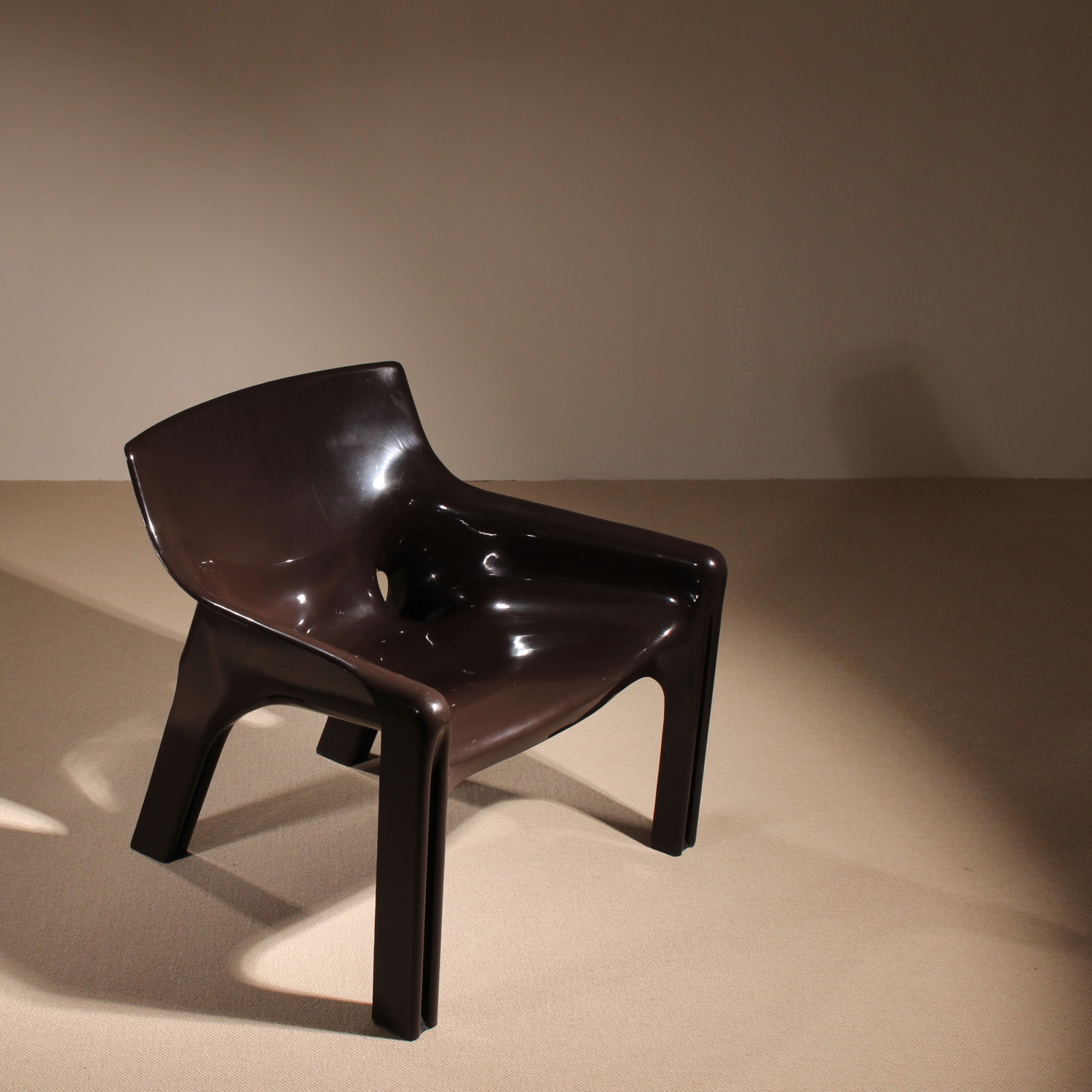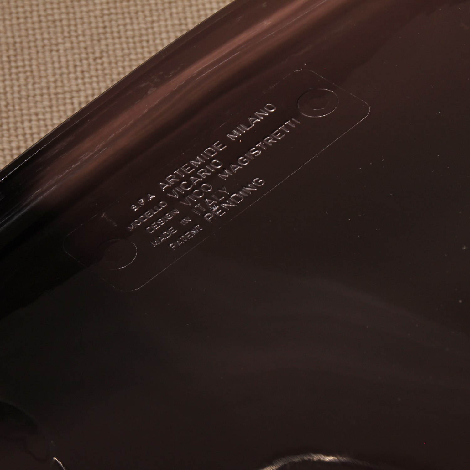 Offered here are the iconic design works by Vico Magistretti for Artemide, 1970. This exceptional set includes eight „Vicario“ lounge chairs. Finished in the rare original color „Marrone Testa di Moro“ – a very dark brown with deep aubergine undertones – these pieces feature a sculptural form made of high-quality, dyed-through material. This design is a milestone of modern Italian design and is featured in collections such as the MoMA.