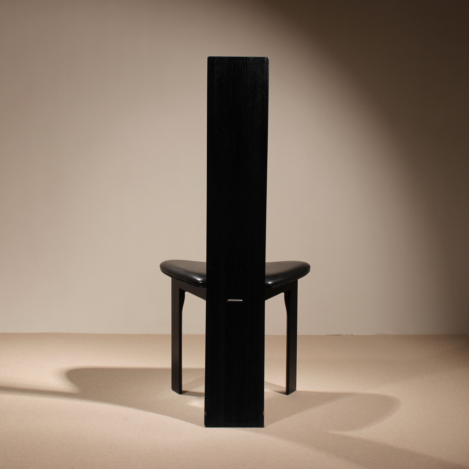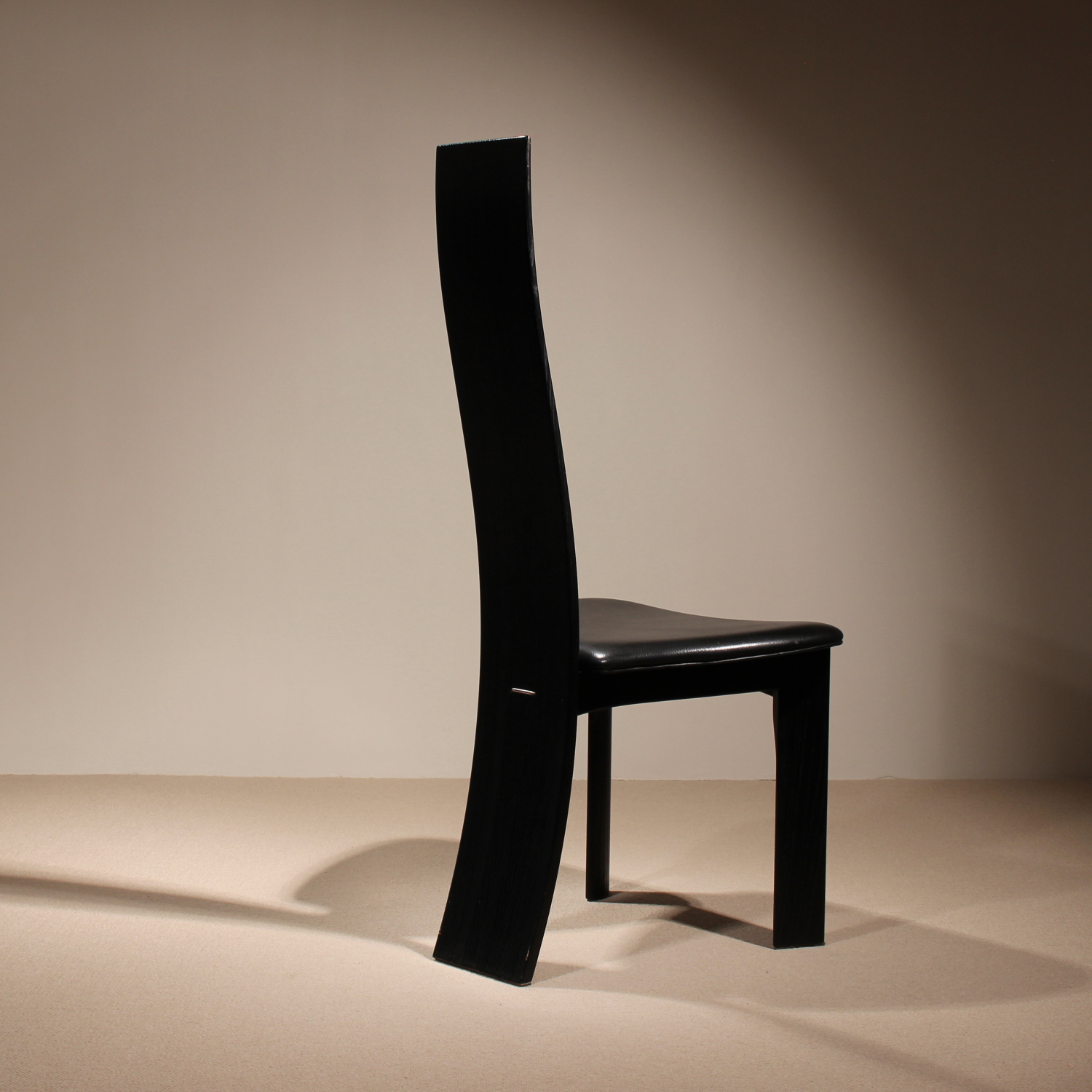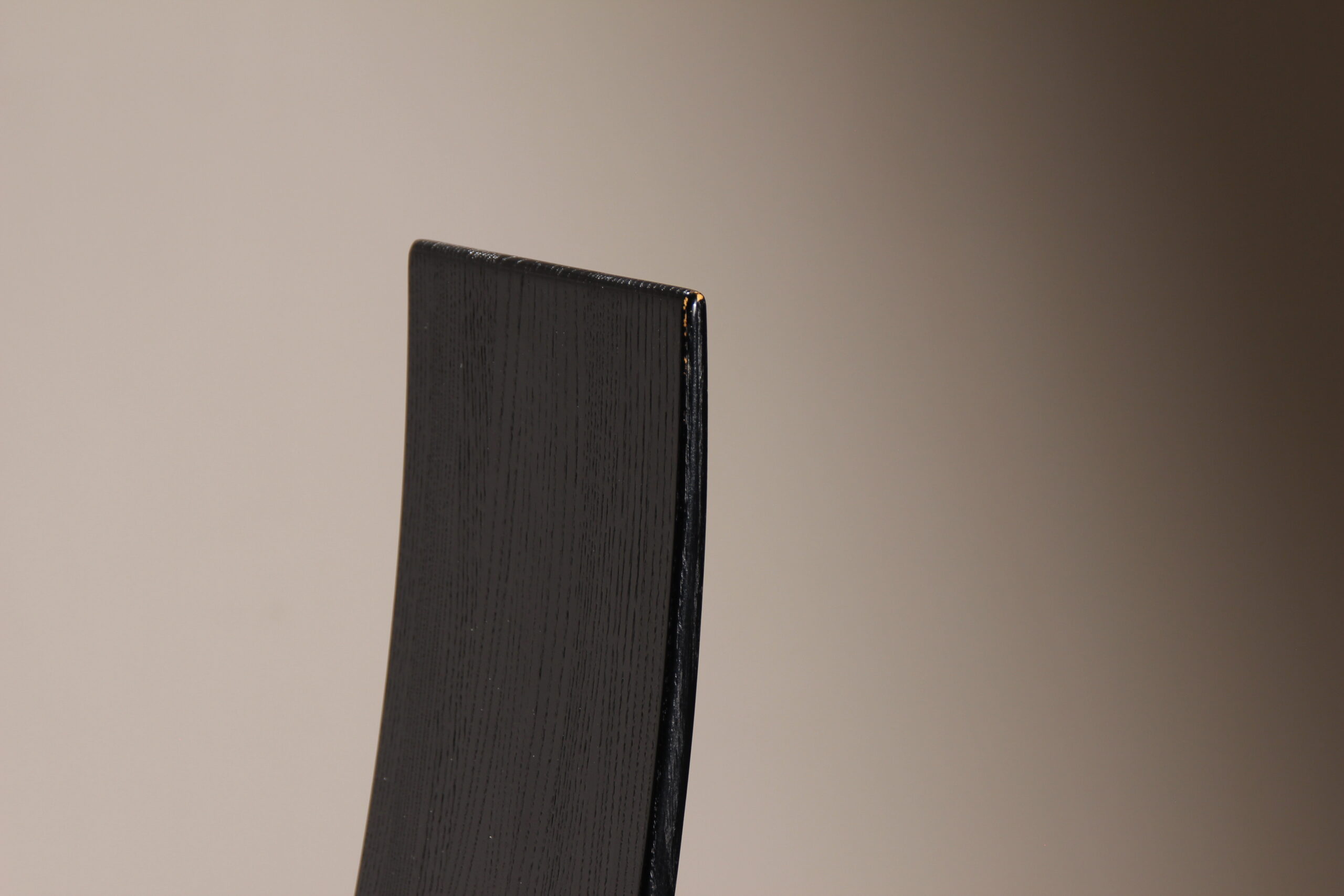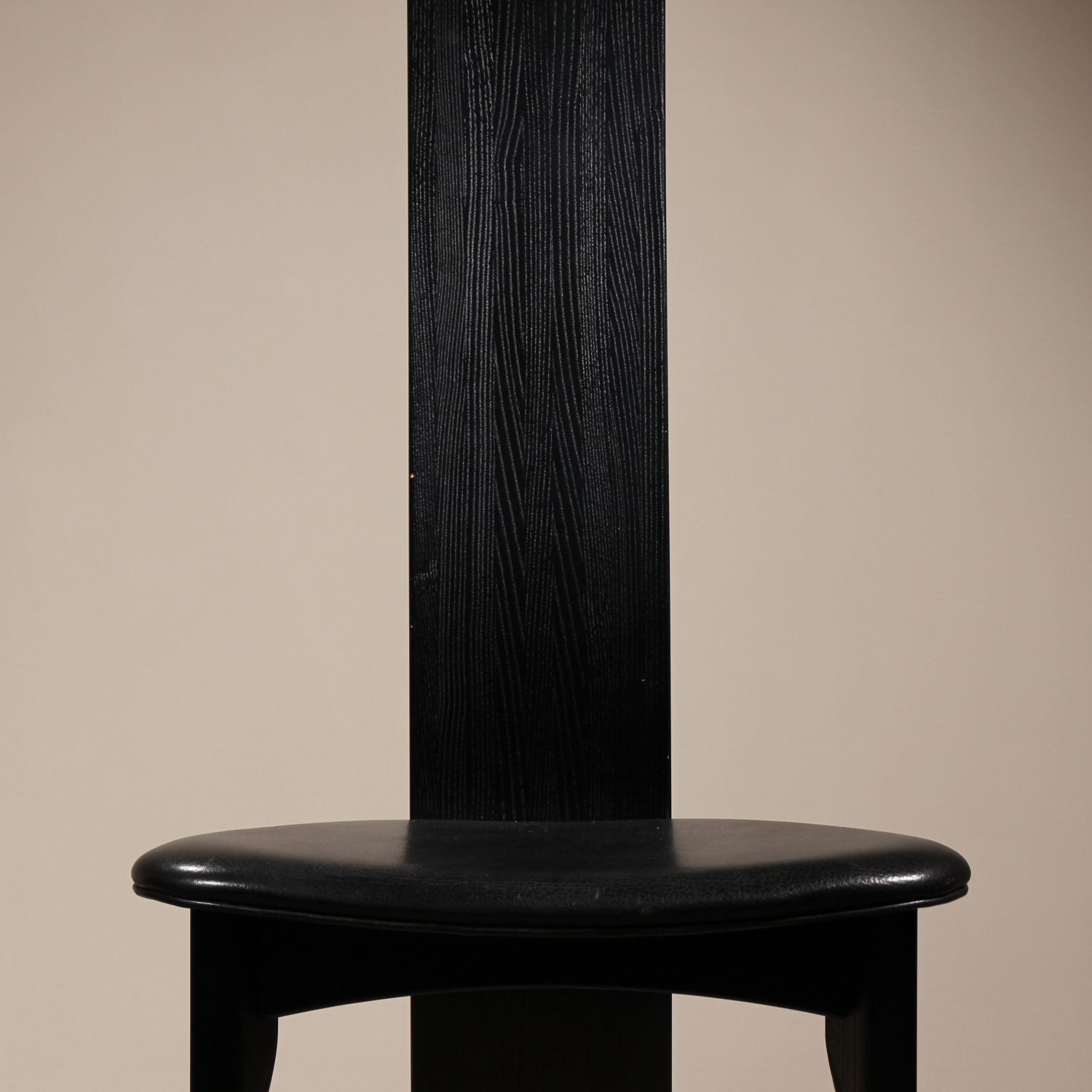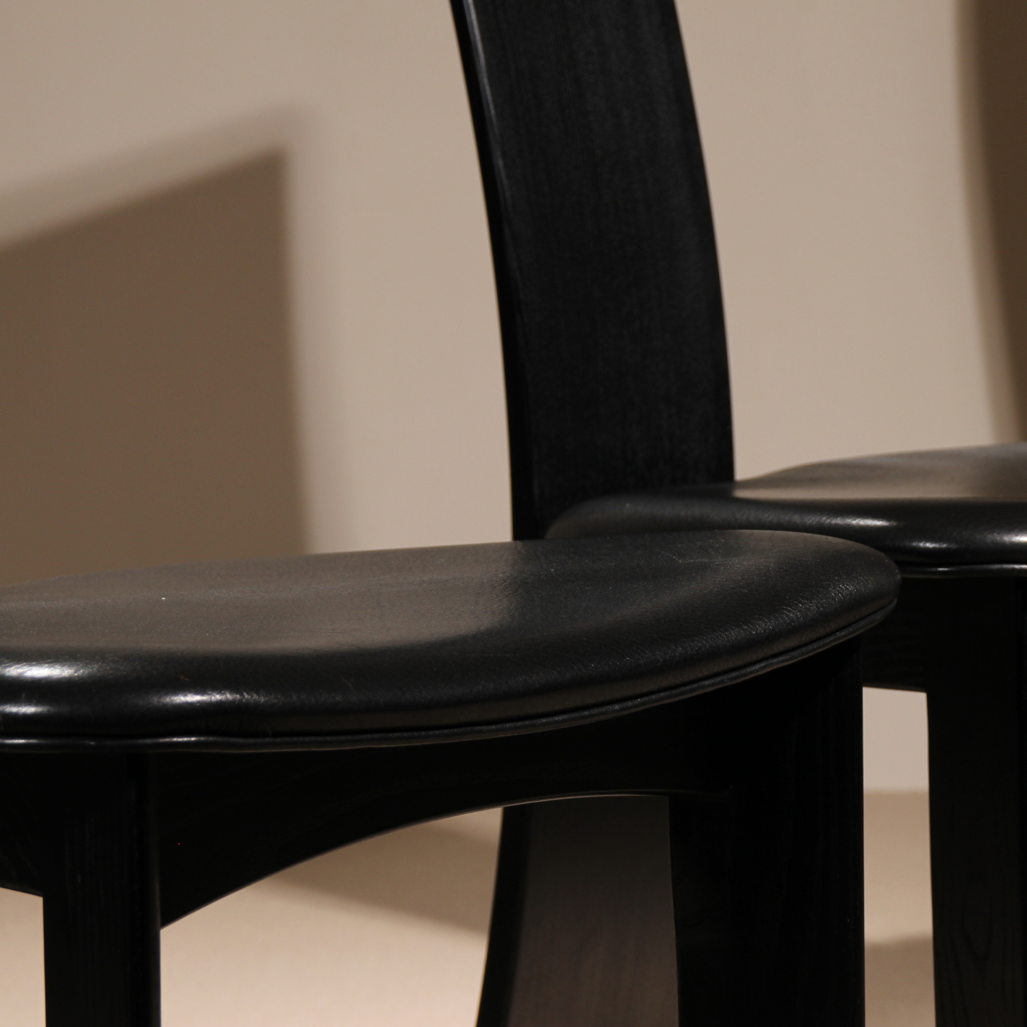 The chairs are finished in deep black, allowing the natural grain of the wood to remain beautifully visible. The seats taper towards the backrest and are upholstered in black leather. Despite the radical look, the model offers excellent sitting comfort and stability. A striking statement piece of Danish craftsmanship, bearing the original ‚Danish Furnituremakers Control‘ seal.