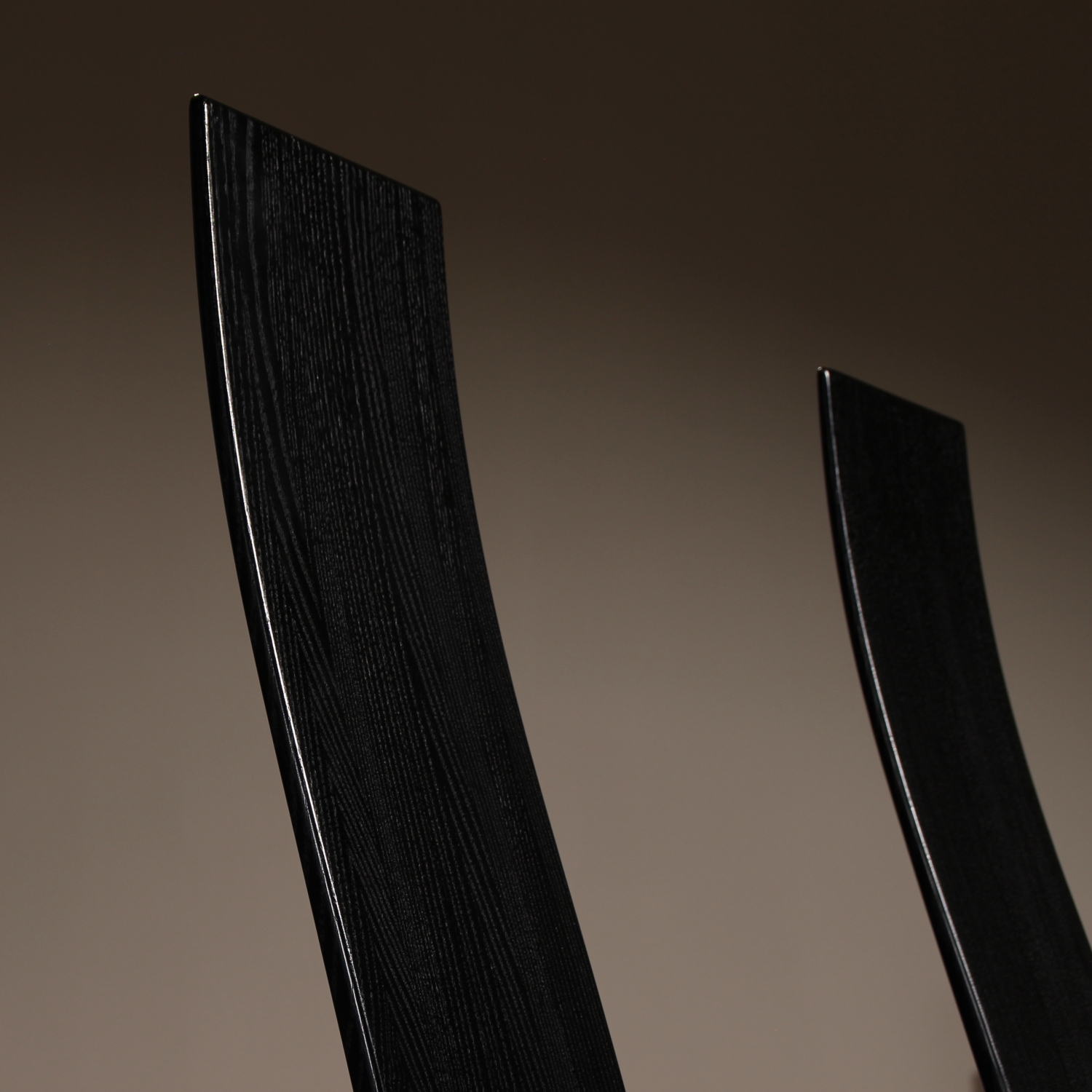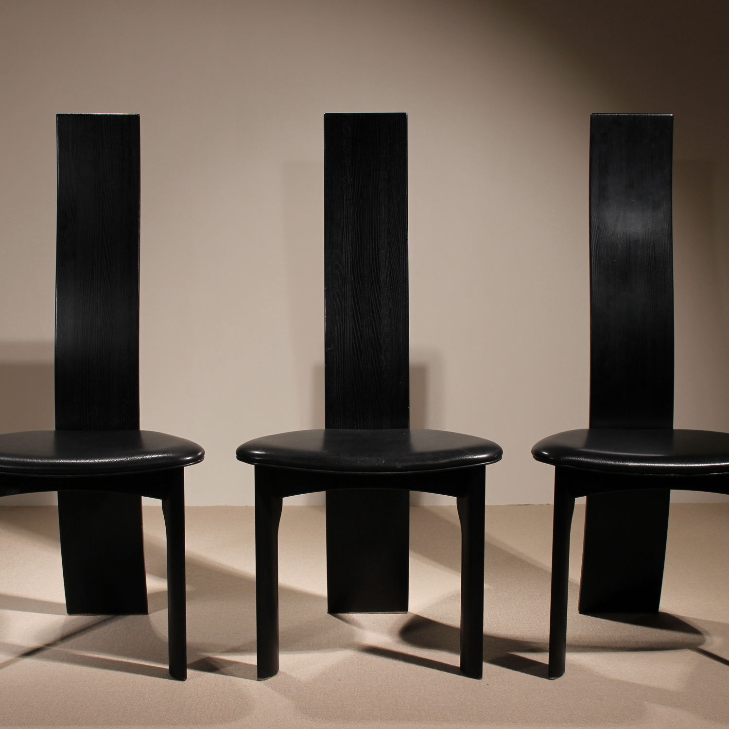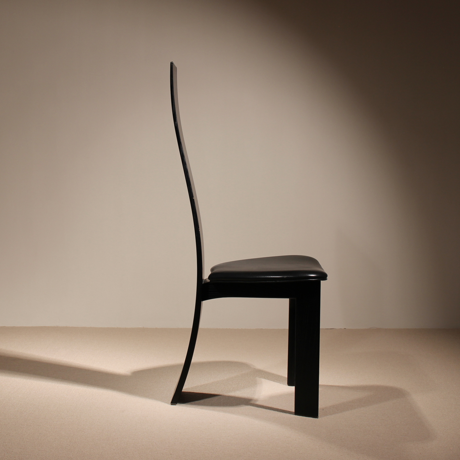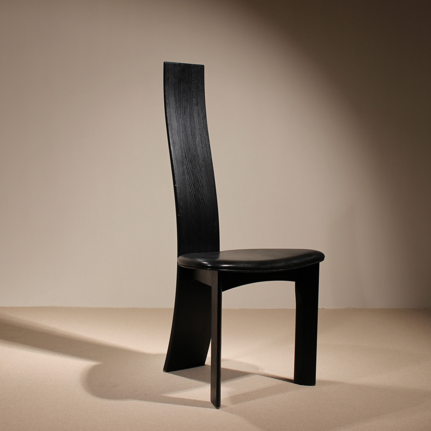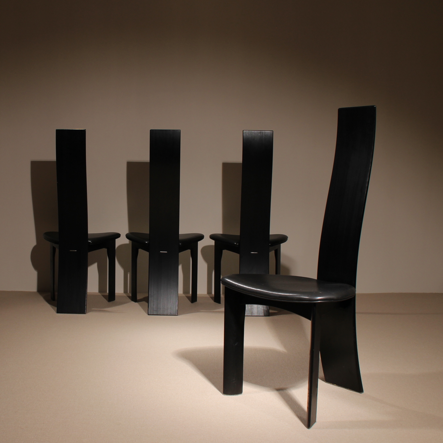 The chairs are finished in deep black, allowing the natural grain of the wood to remain beautifully visible. The seats taper towards the backrest and are upholstered in black leather. Despite the radical look, the model offers excellent sitting comfort and stability. A striking statement piece of Danish craftsmanship, bearing the original ‚Danish Furnituremakers Control‘ seal.
