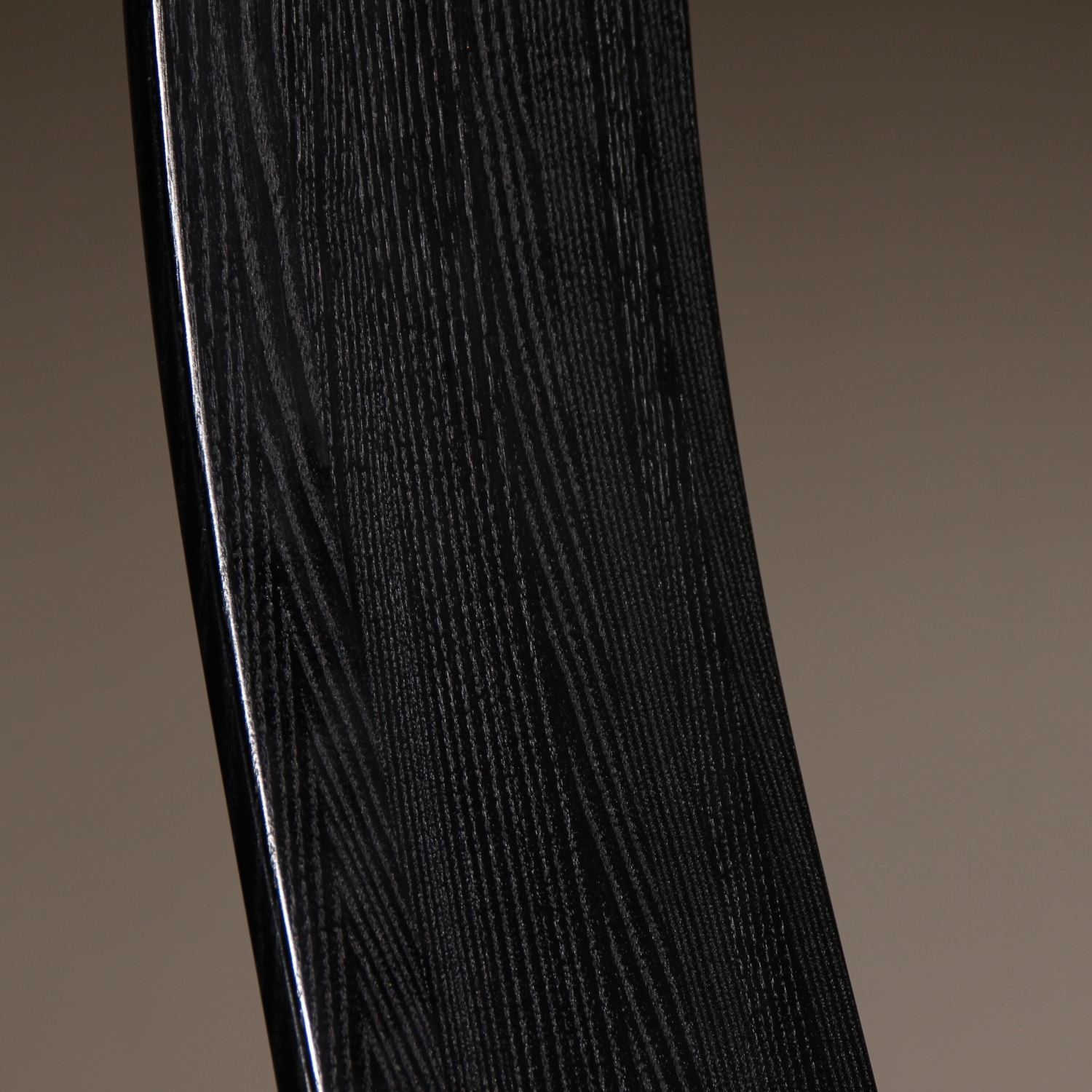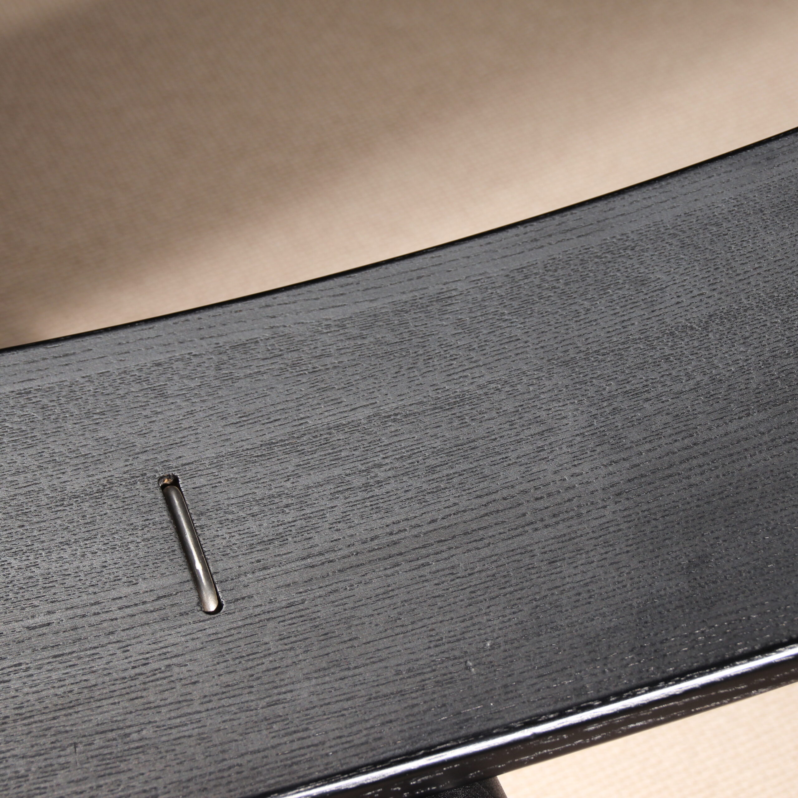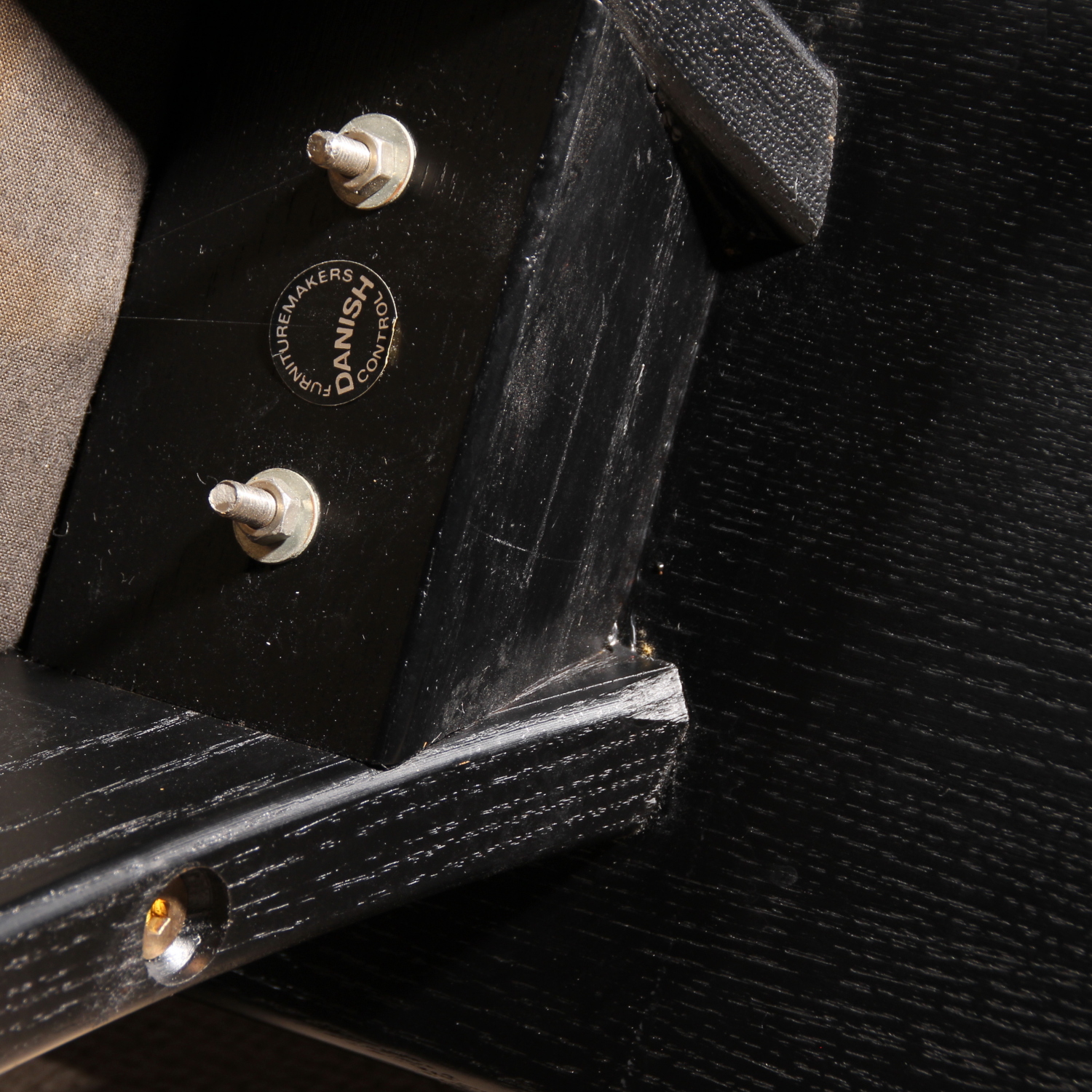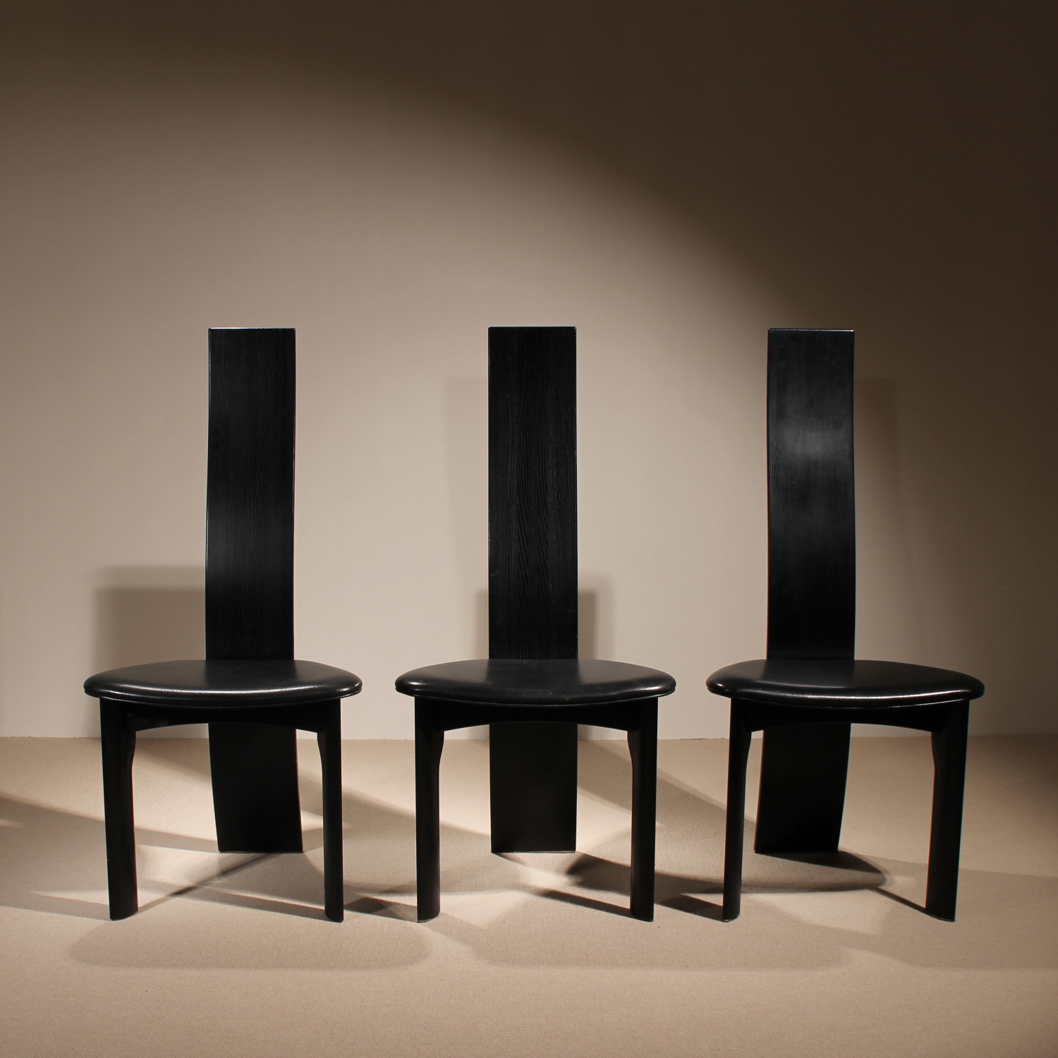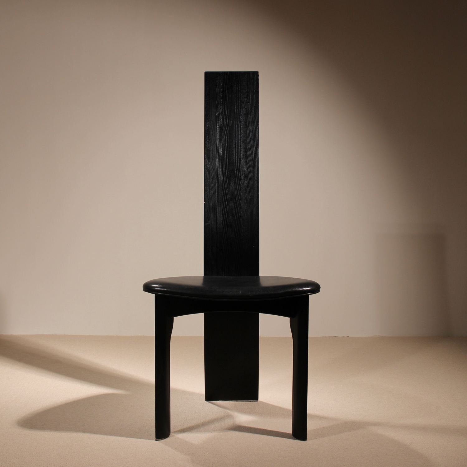 The chairs are finished in deep black, allowing the natural grain of the wood to remain beautifully visible. The seats taper towards the backrest and are upholstered in black leather. Despite the radical look, the model offers excellent sitting comfort and stability. A striking statement piece of Danish craftsmanship, bearing the original ‚Danish Furnituremakers Control‘ seal.