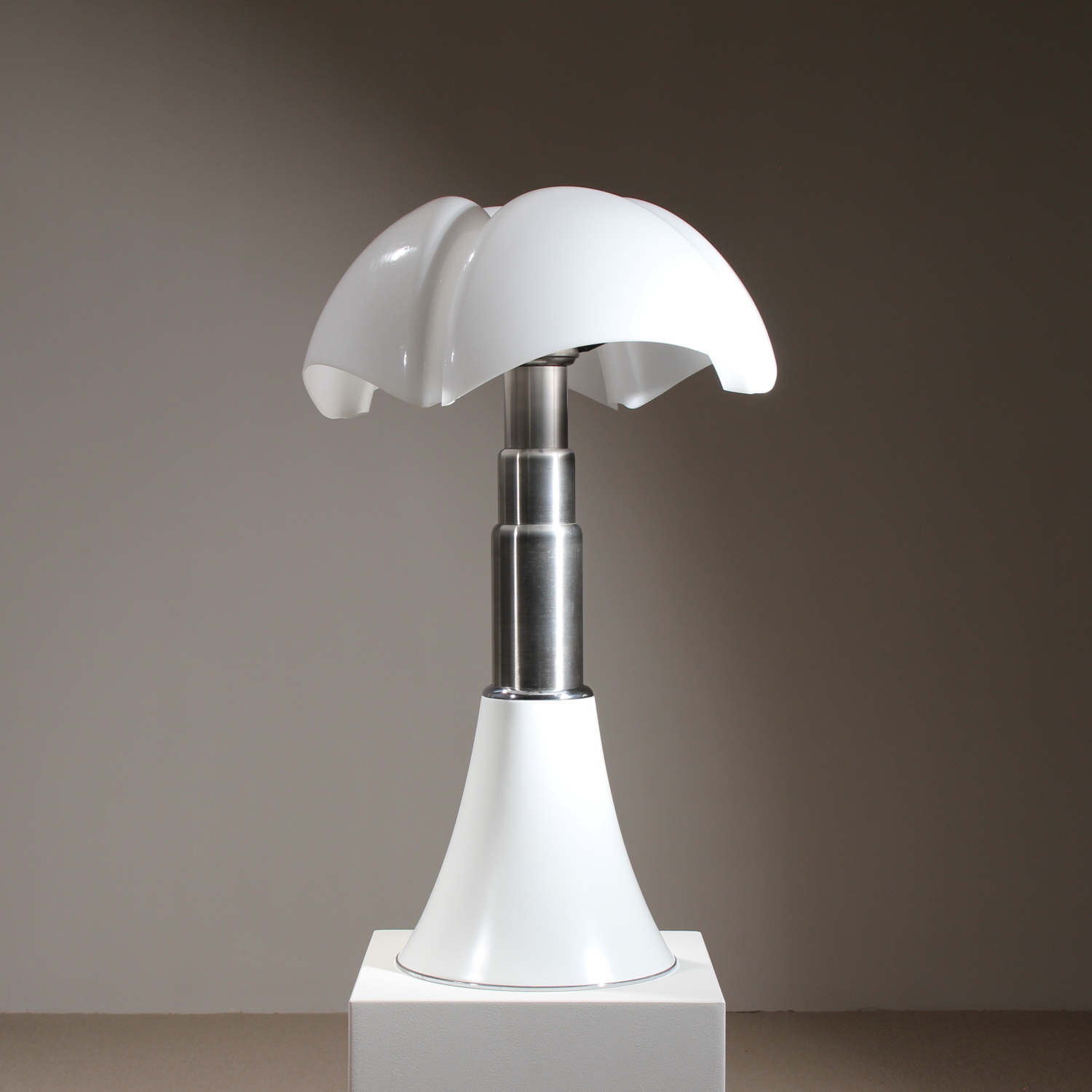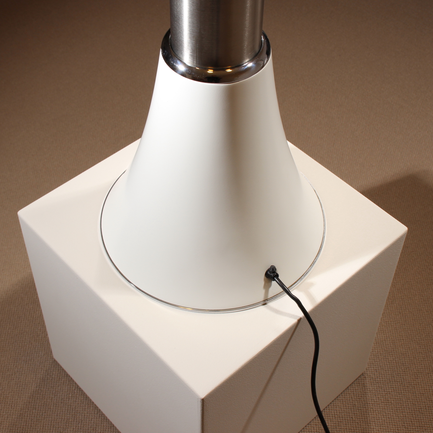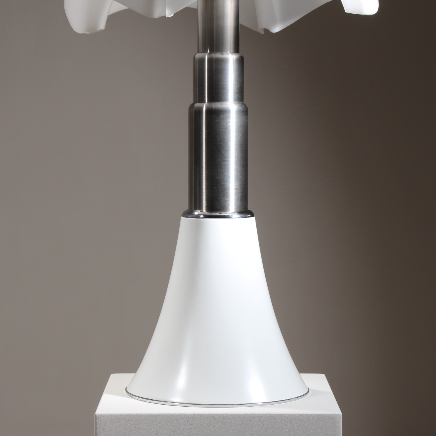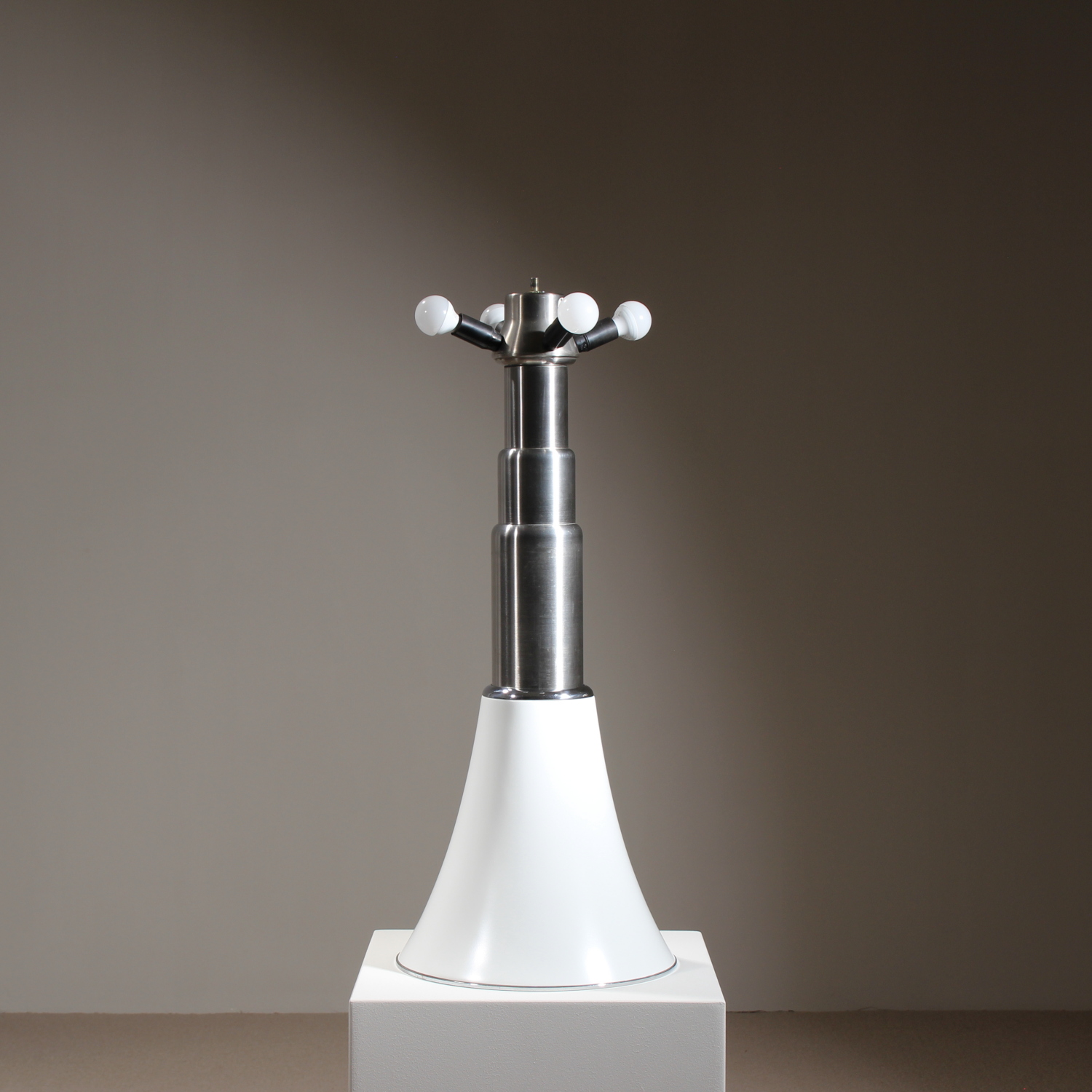 This iconic table lamp was designed by Gae Aulenti. The design dates back to 1965, and this specific piece in the large version was manufactured in the 1980s. The lamp features a stainless steel telescopic neck for height adjustment and a striking four-part shade made of opal white acrylic glass. The curved base is finished in an elegant, muted white tone. Its extraordinary design makes it a timeless classic of Italian design.