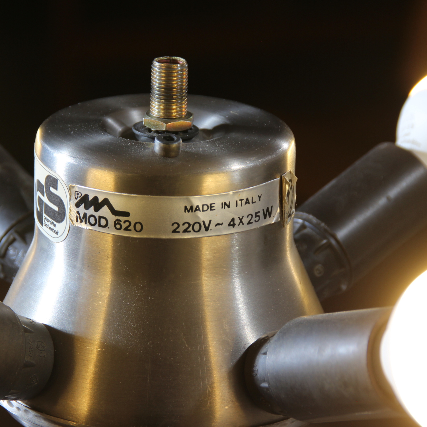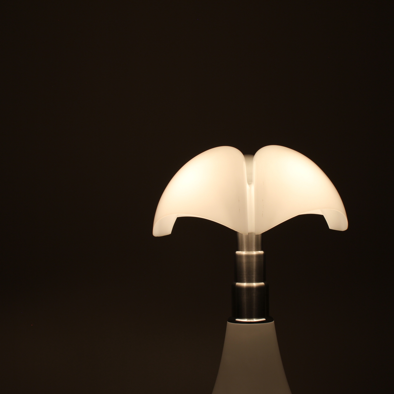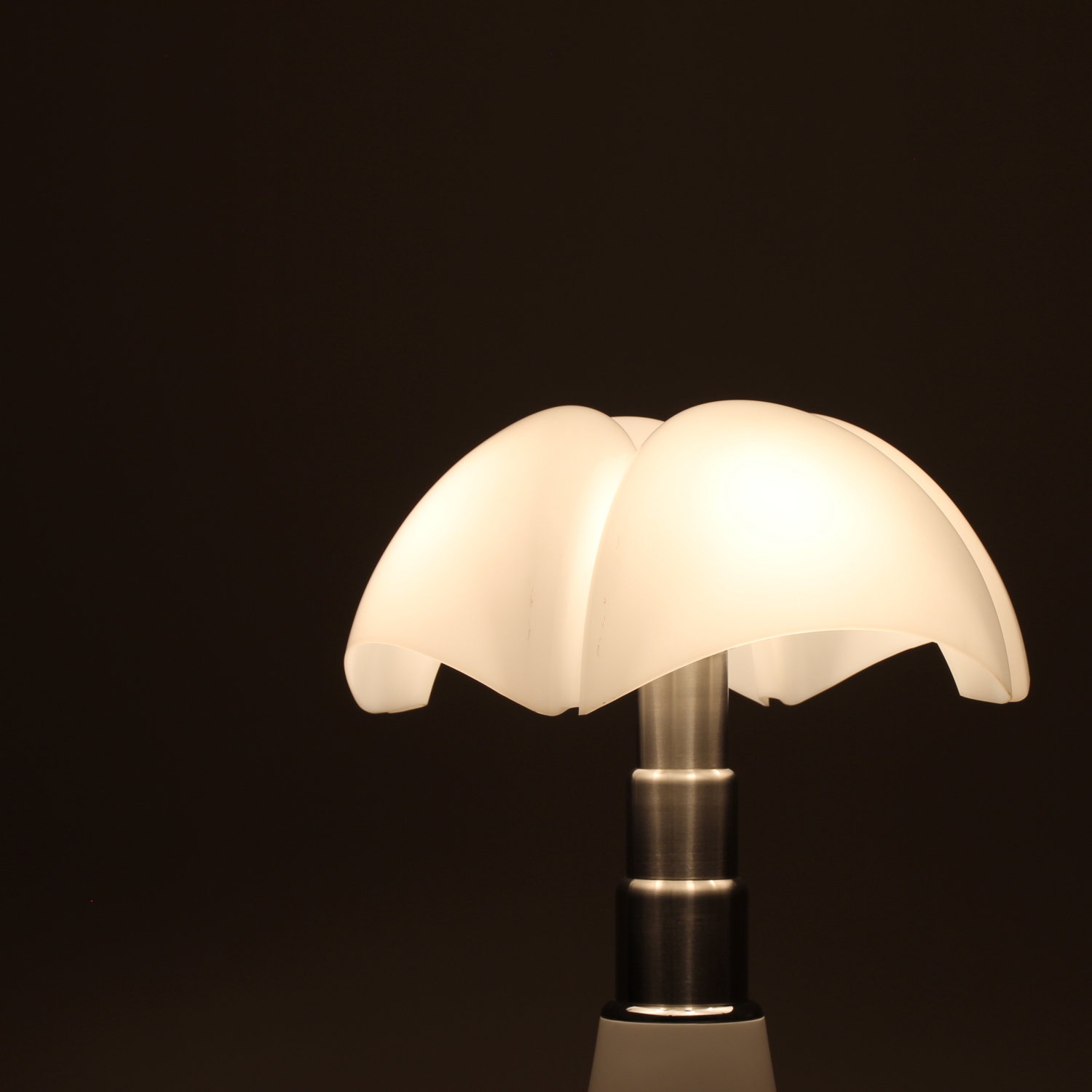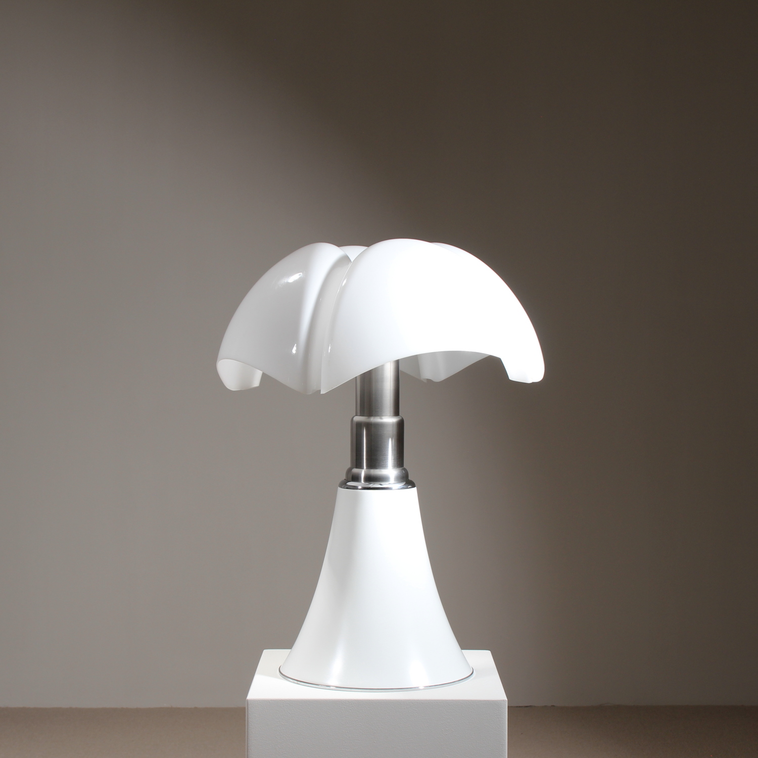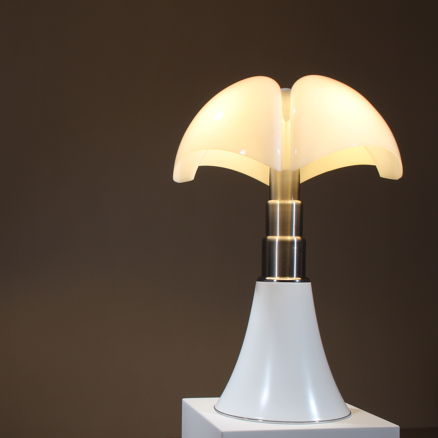 This iconic table lamp was designed by Gae Aulenti. The design dates back to 1965, and this specific piece in the large version was manufactured in the 1980s. The lamp features a stainless steel telescopic neck for height adjustment and a striking four-part shade made of opal white acrylic glass. The curved base is finished in an elegant, muted white tone. Its extraordinary design makes it a timeless classic of Italian design.