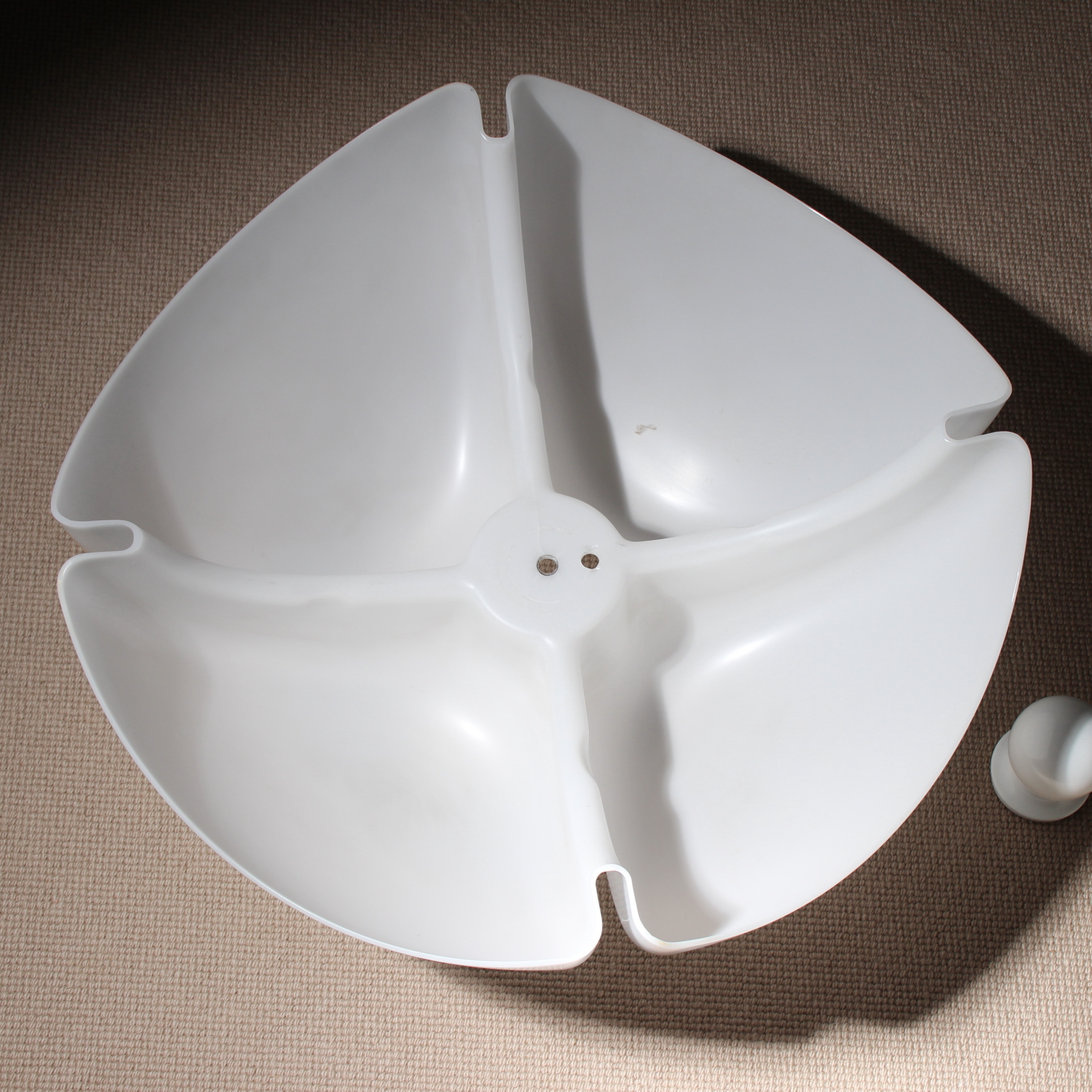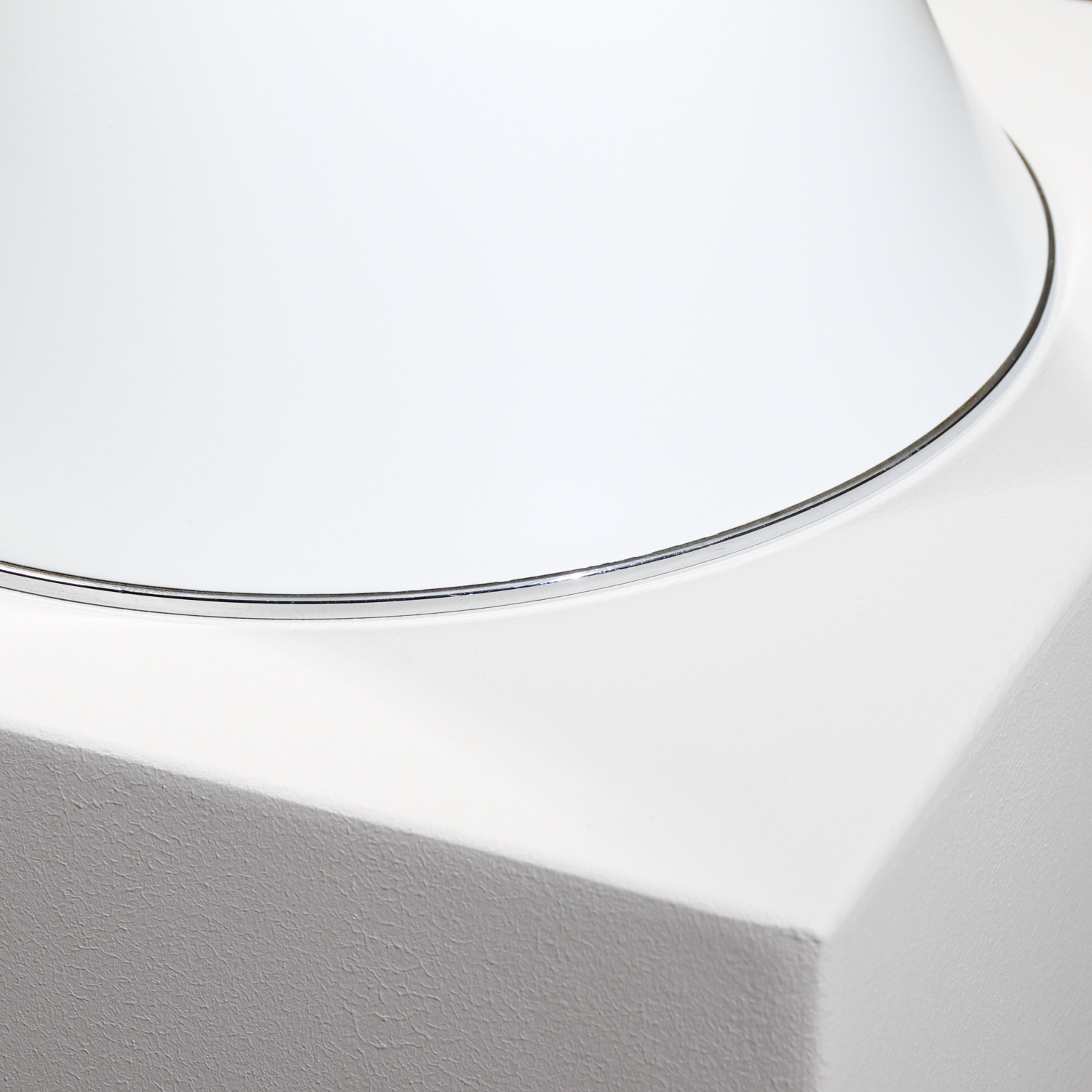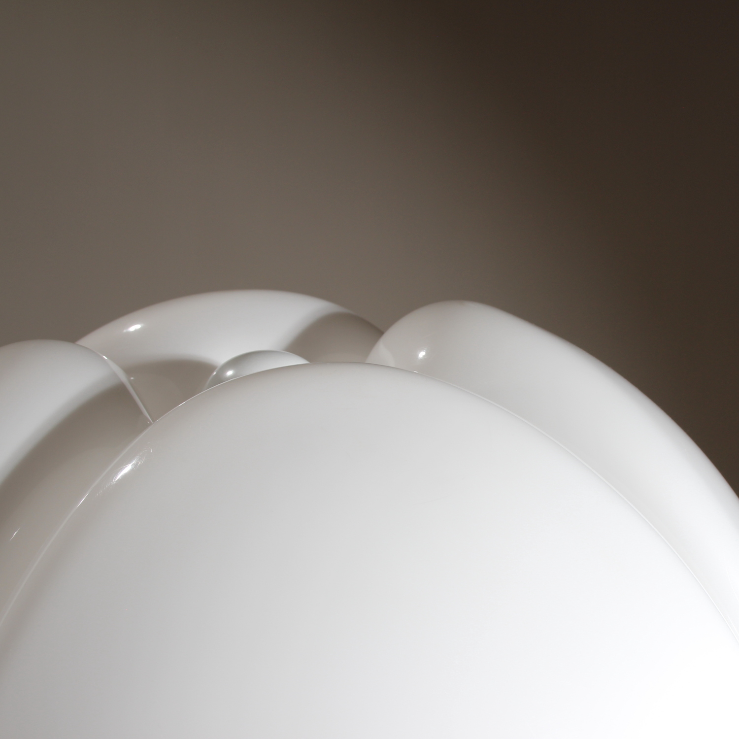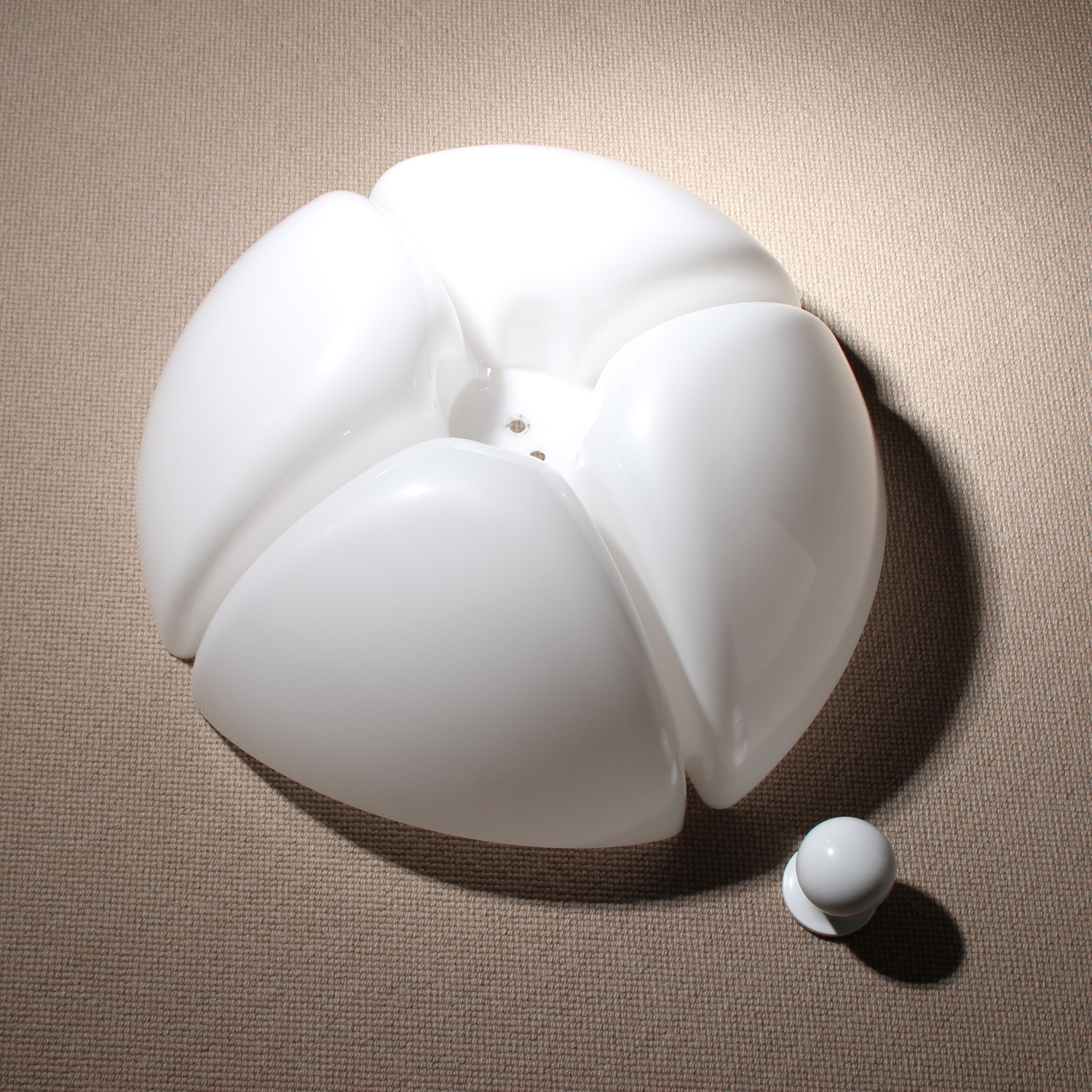 This iconic table lamp was designed by Gae Aulenti. The design dates back to 1965, and this specific piece in the large version was manufactured in the 1980s. The lamp features a stainless steel telescopic neck for height adjustment and a striking four-part shade made of opal white acrylic glass. The curved base is finished in an elegant, muted white tone. Its extraordinary design makes it a timeless classic of Italian design.