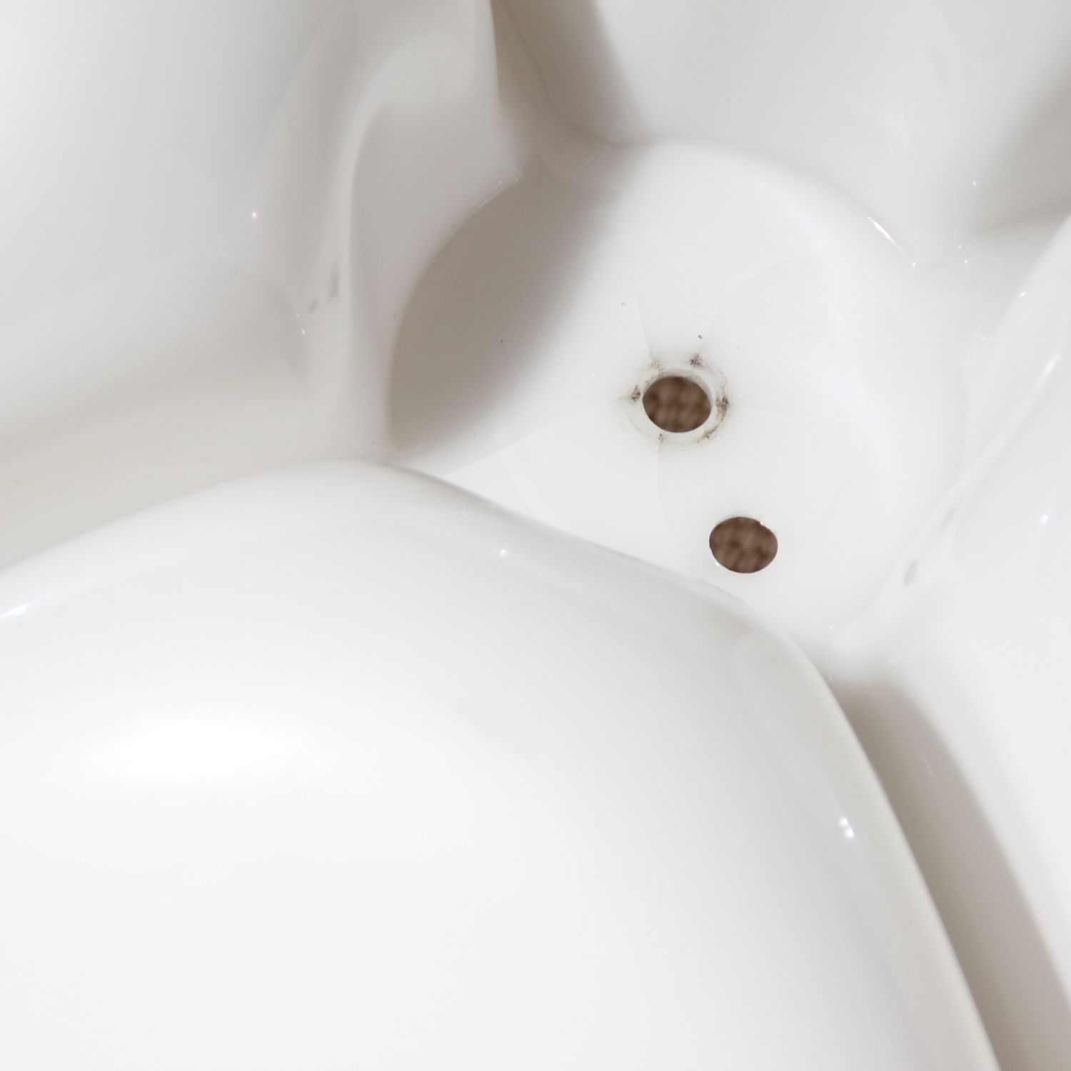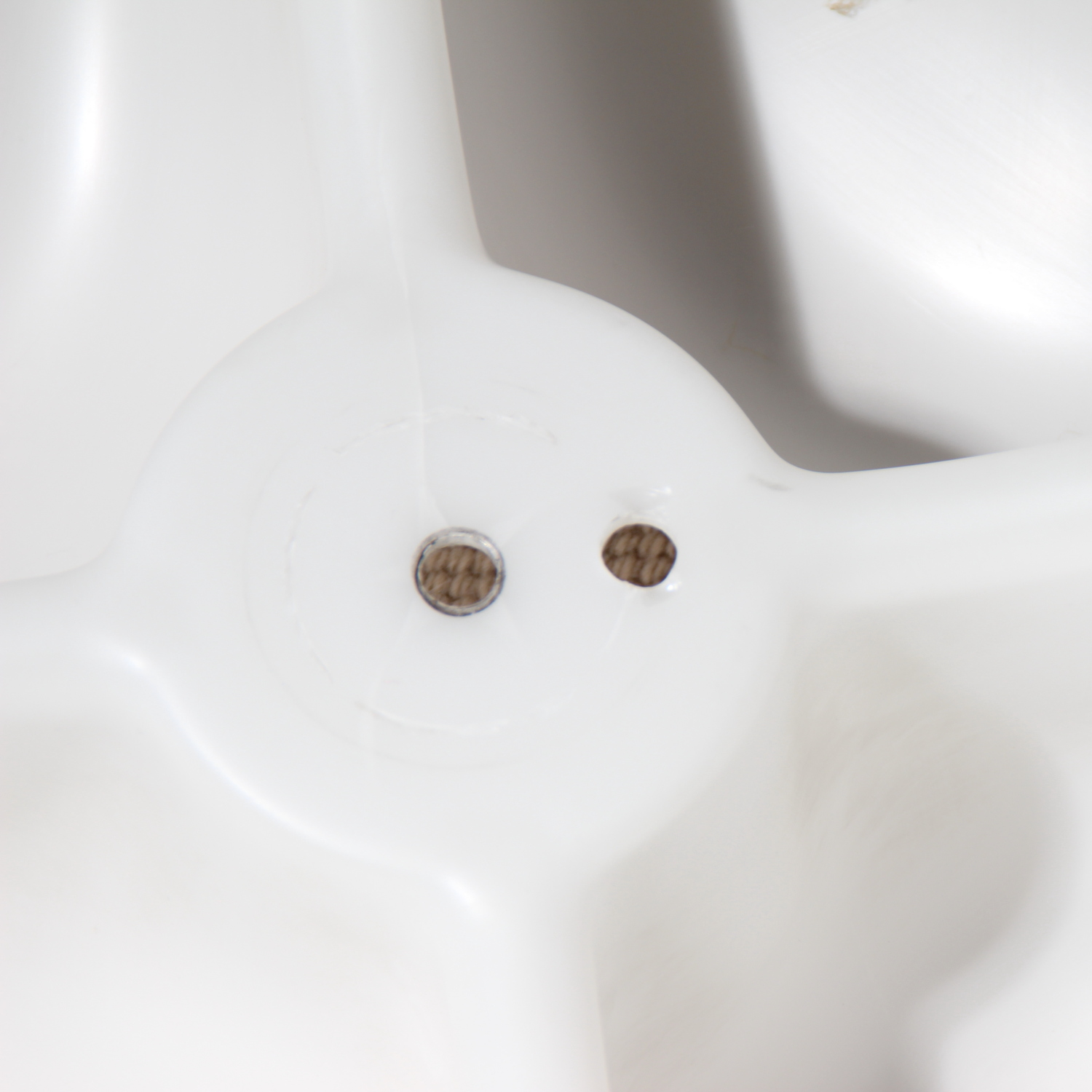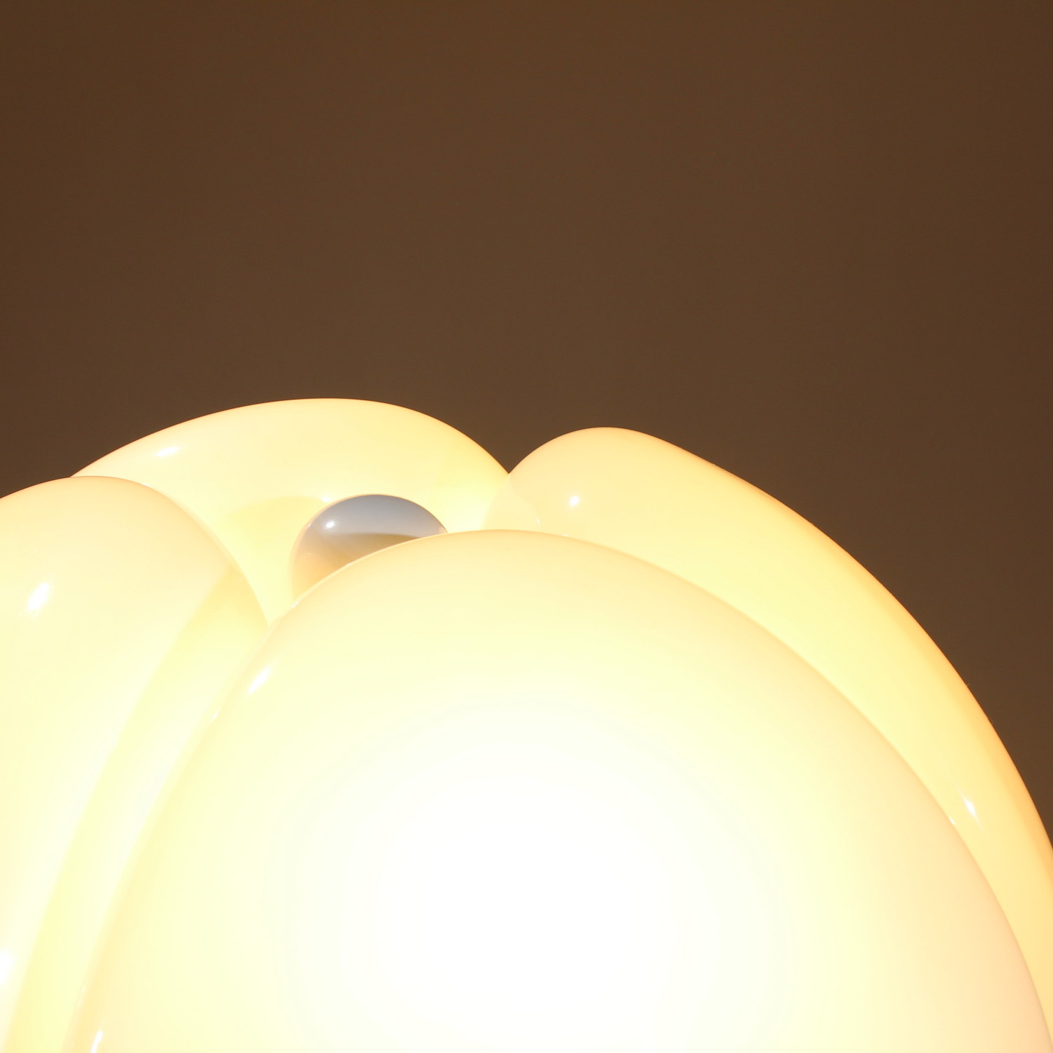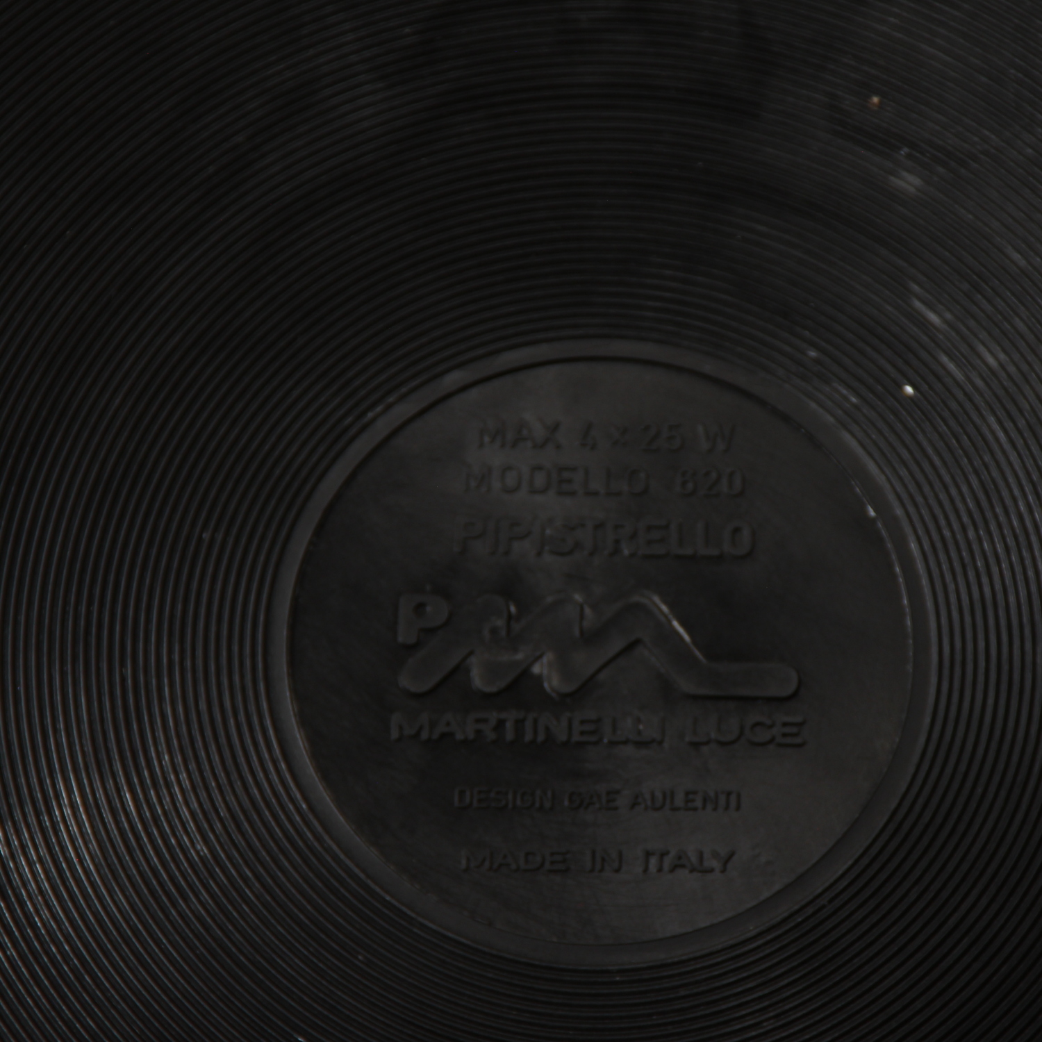The lamp is in very good condition with a light, authentic patina. There are slight stress cracks on the acrylic shade near the upper fixing under the button. These are not noticeable when assembled and do not affect the aesthetics or stability. For further details, please refer to the attached photos.