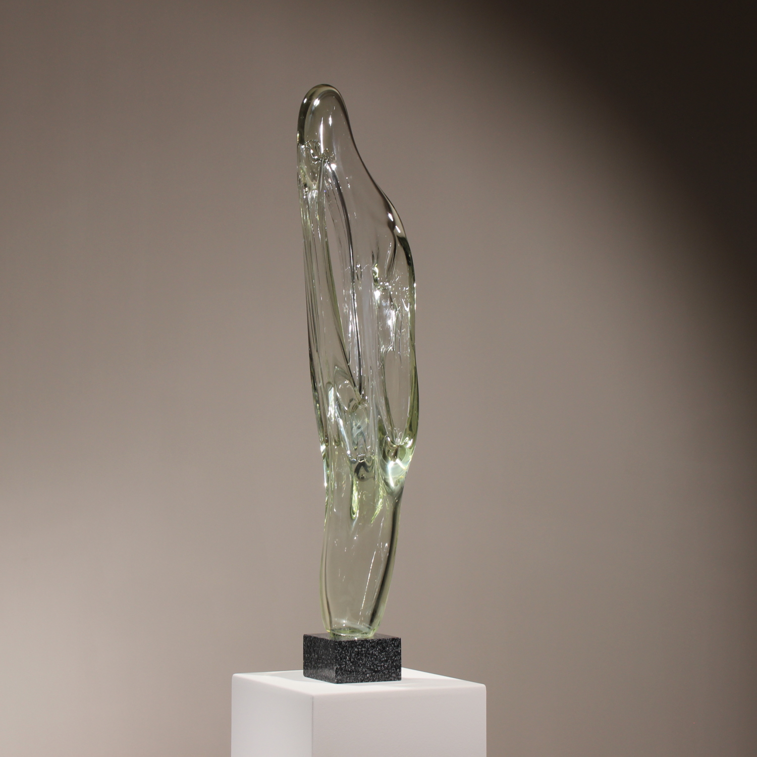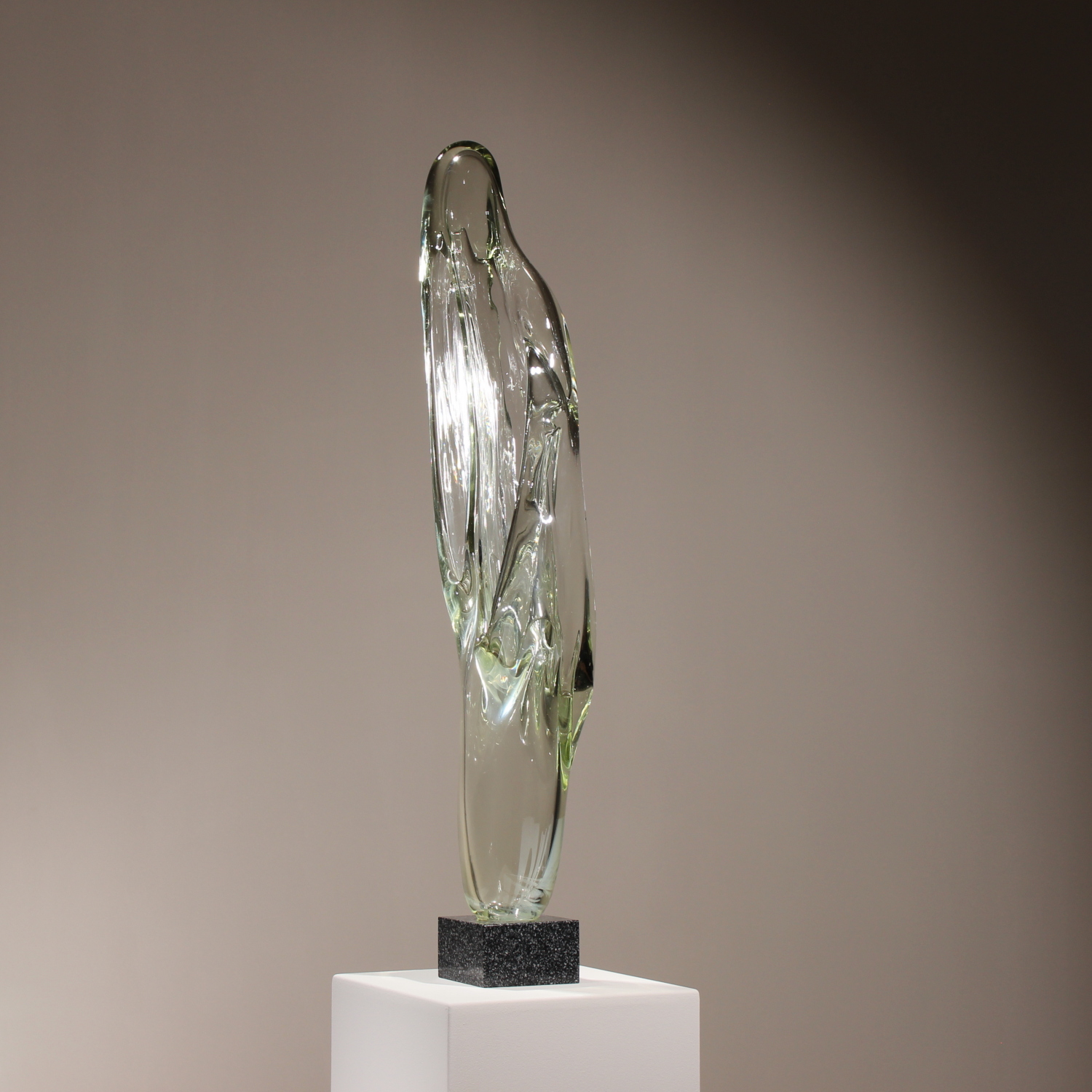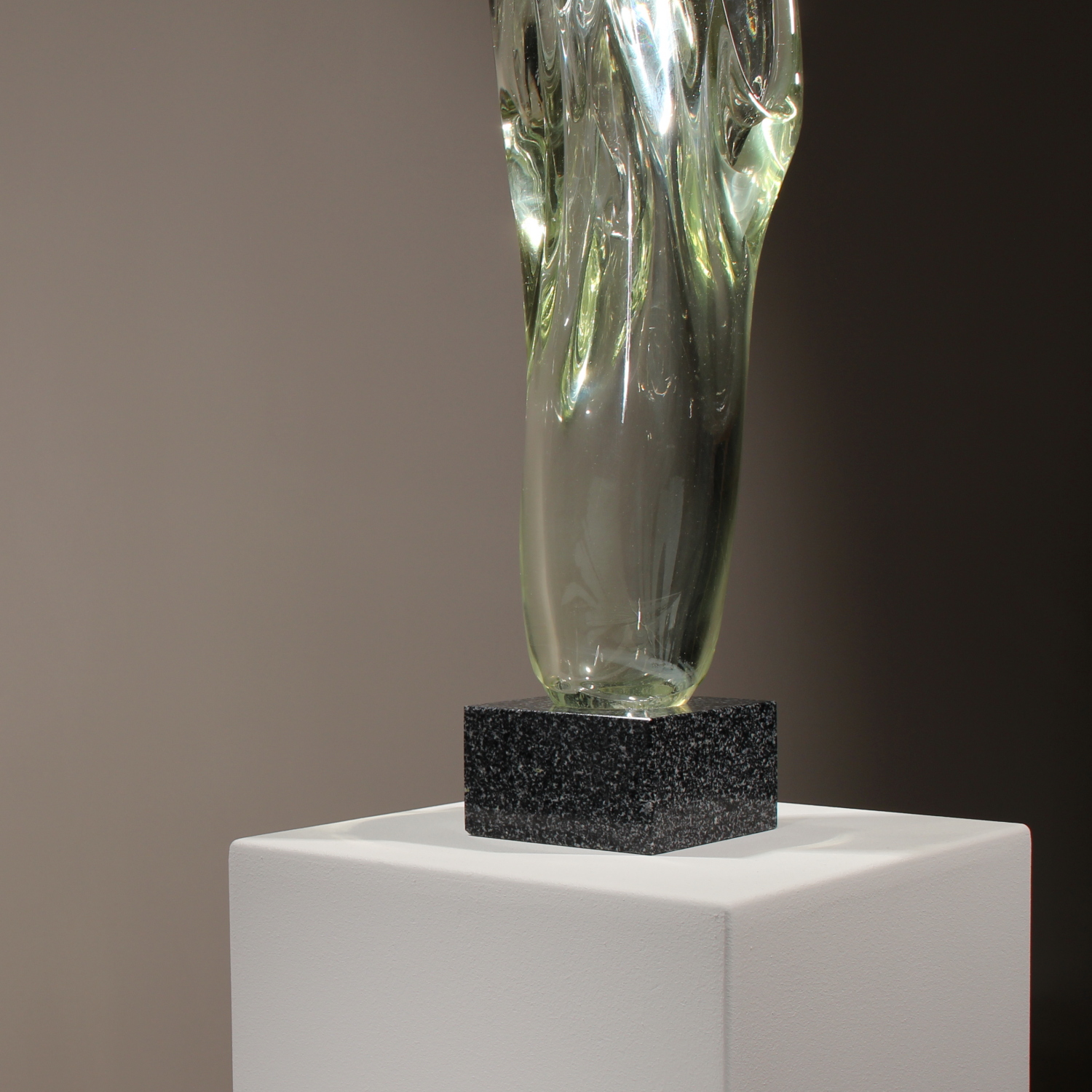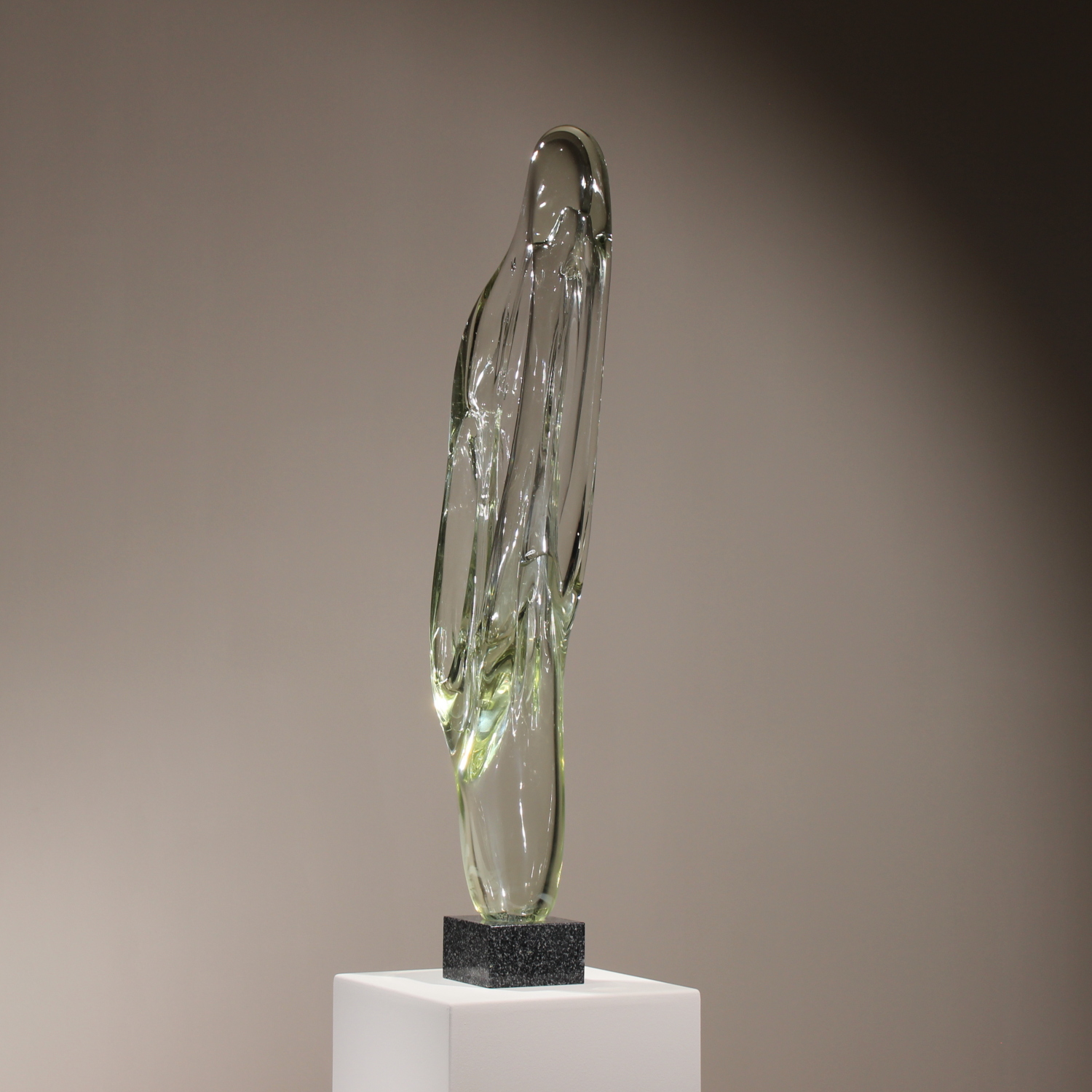 For sale is an extraordinary unique sculpture from 1987. With an impressive total height of ca. 94 cm, this is a technically demanding work of Eastern European glass art, impressing through its sheer size and massive presence. The sculpture is formed from solid glass, featuring a subtle green-yellow tint characteristic of high-quality studio glass. Inside the glass body, organic vertical structures appear like frozen waves. The interplay with light gives the object a fascinating depth and emphasizes its sculptural dynamics. The piece rests securely on a heavy, geometric base of polished dark granite. The piece is hand-signed and dated on the lower edge of the glass. The engraving is inscribed as ‚Caviersecha‘ and marked with ‚X 87‘. This detailed marking and the provenance from a specialized Eastern European artist’s studio emphasize the unique status of this collector’s item.