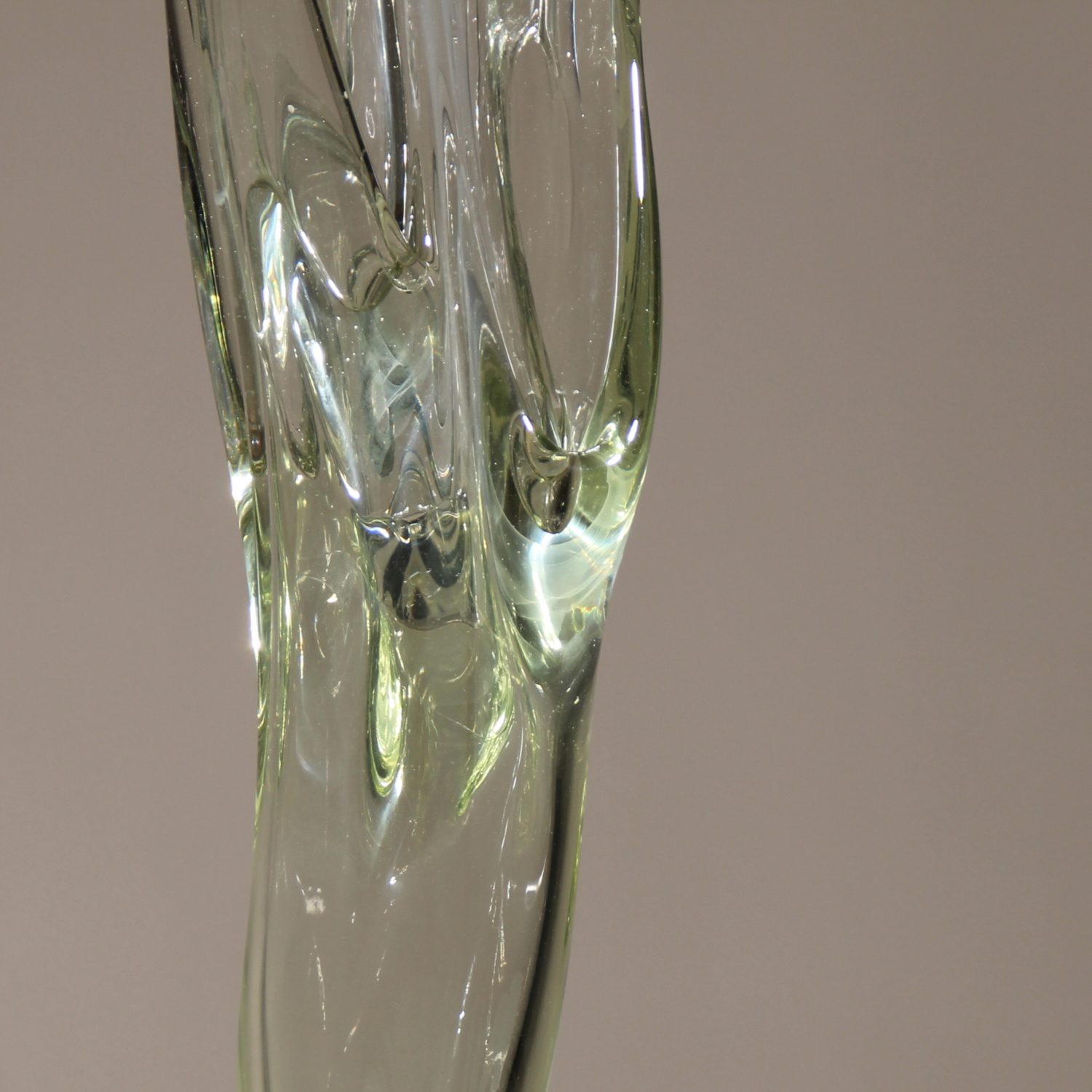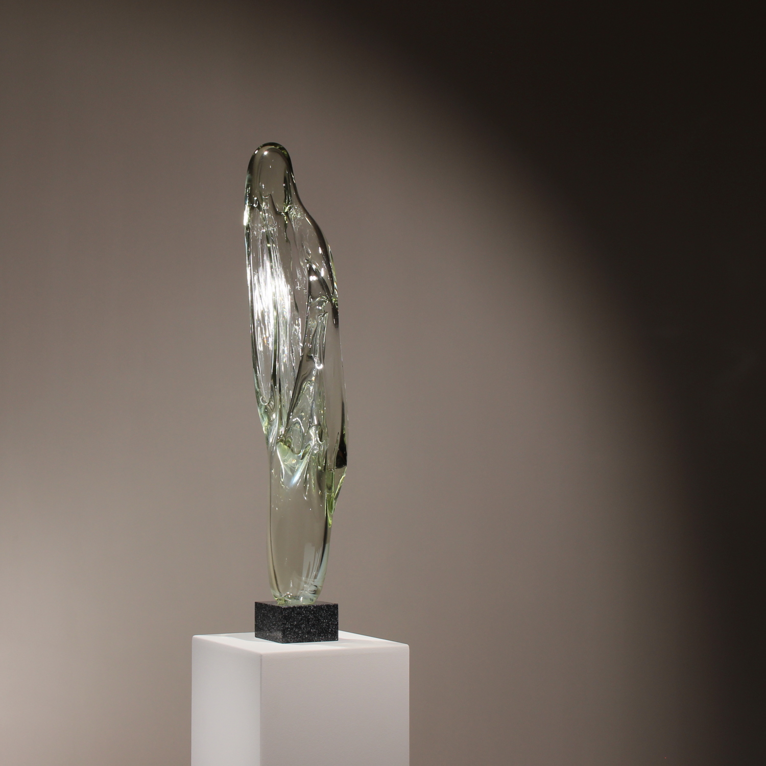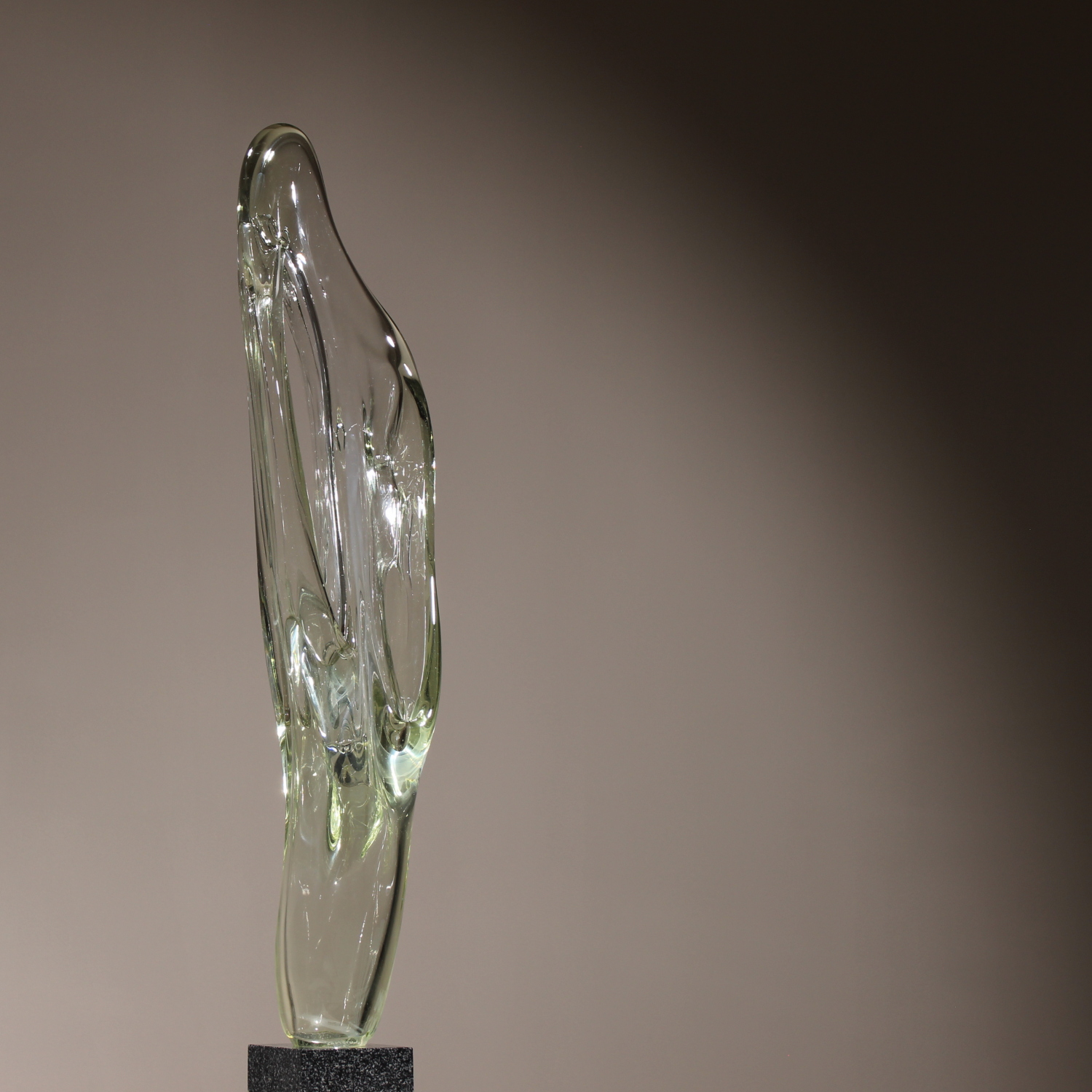 For sale is an extraordinary unique sculpture from 1987. With an impressive total height of ca. 94 cm, this is a technically demanding work of Eastern European glass art, impressing through its sheer size and massive presence. The sculpture is formed from solid glass, featuring a subtle green-yellow tint characteristic of high-quality studio glass. Inside the glass body, organic vertical structures appear like frozen waves. The interplay with light gives the object a fascinating depth and emphasizes its sculptural dynamics. The piece rests securely on a heavy, geometric base of polished dark granite. The piece is hand-signed and dated on the lower edge of the glass. The engraving is inscribed as ‚Caviersecha‘ and marked with ‚X 87‘. This detailed marking and the provenance from a specialized Eastern European artist’s studio emphasize the unique status of this collector’s item.