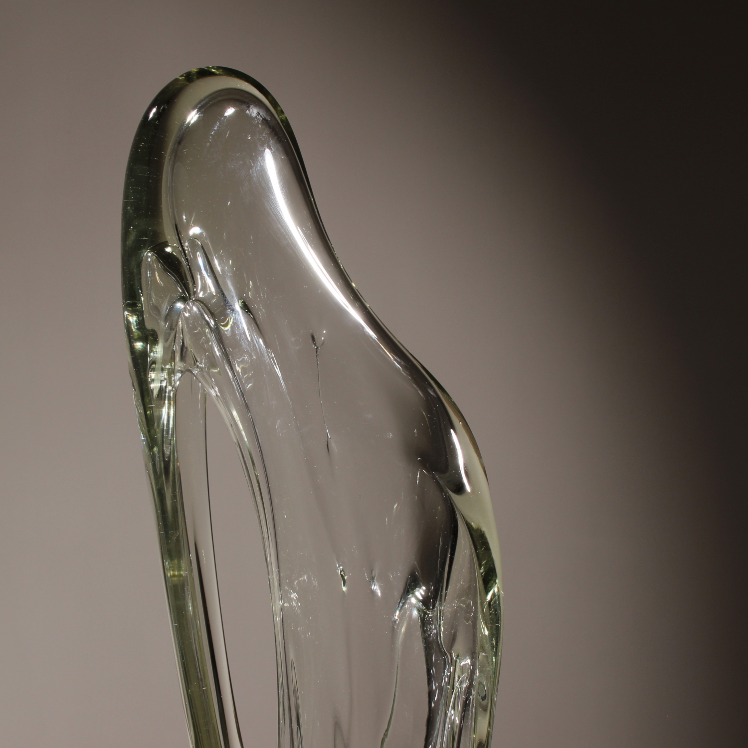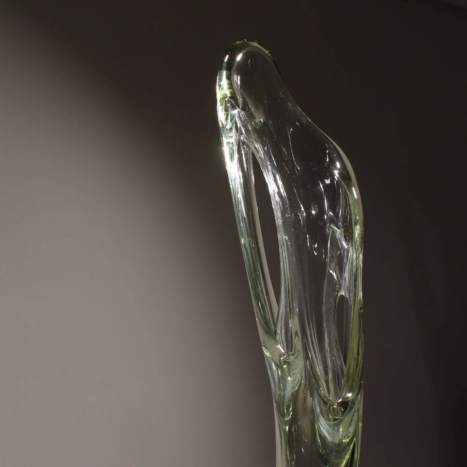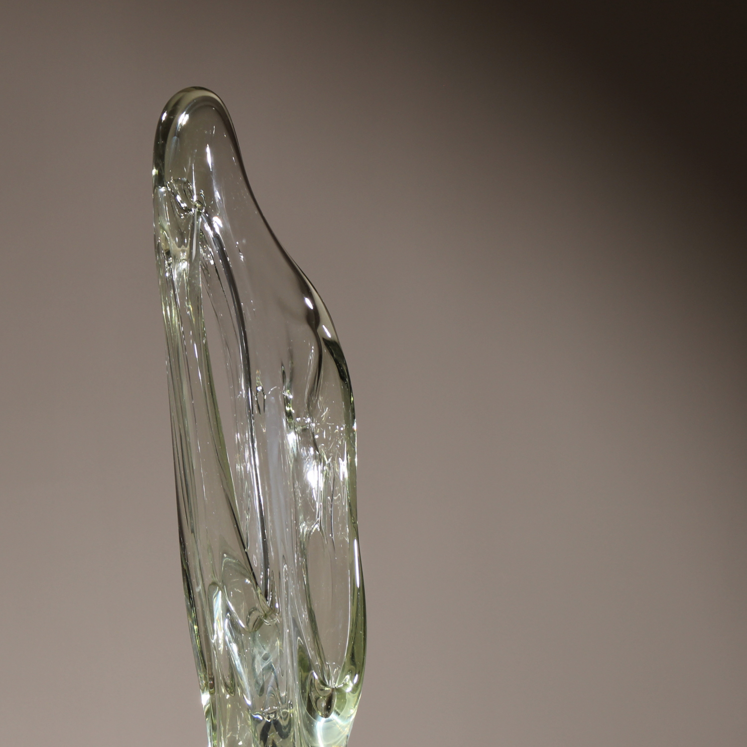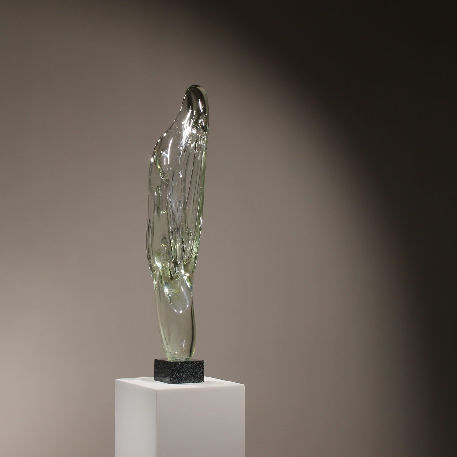 For sale is an extraordinary unique sculpture from 1987. With an impressive total height of ca. 94 cm, this is a technically demanding work of Eastern European glass art, impressing through its sheer size and massive presence. The sculpture is formed from solid glass, featuring a subtle green-yellow tint characteristic of high-quality studio glass. Inside the glass body, organic vertical structures appear like frozen waves. The interplay with light gives the object a fascinating depth and emphasizes its sculptural dynamics. The piece rests securely on a heavy, geometric base of polished dark granite. The piece is hand-signed and dated on the lower edge of the glass. The engraving is inscribed as ‚Caviersecha‘ and marked with ‚X 87‘. This detailed marking and the provenance from a specialized Eastern European artist’s studio emphasize the unique status of this collector’s item.