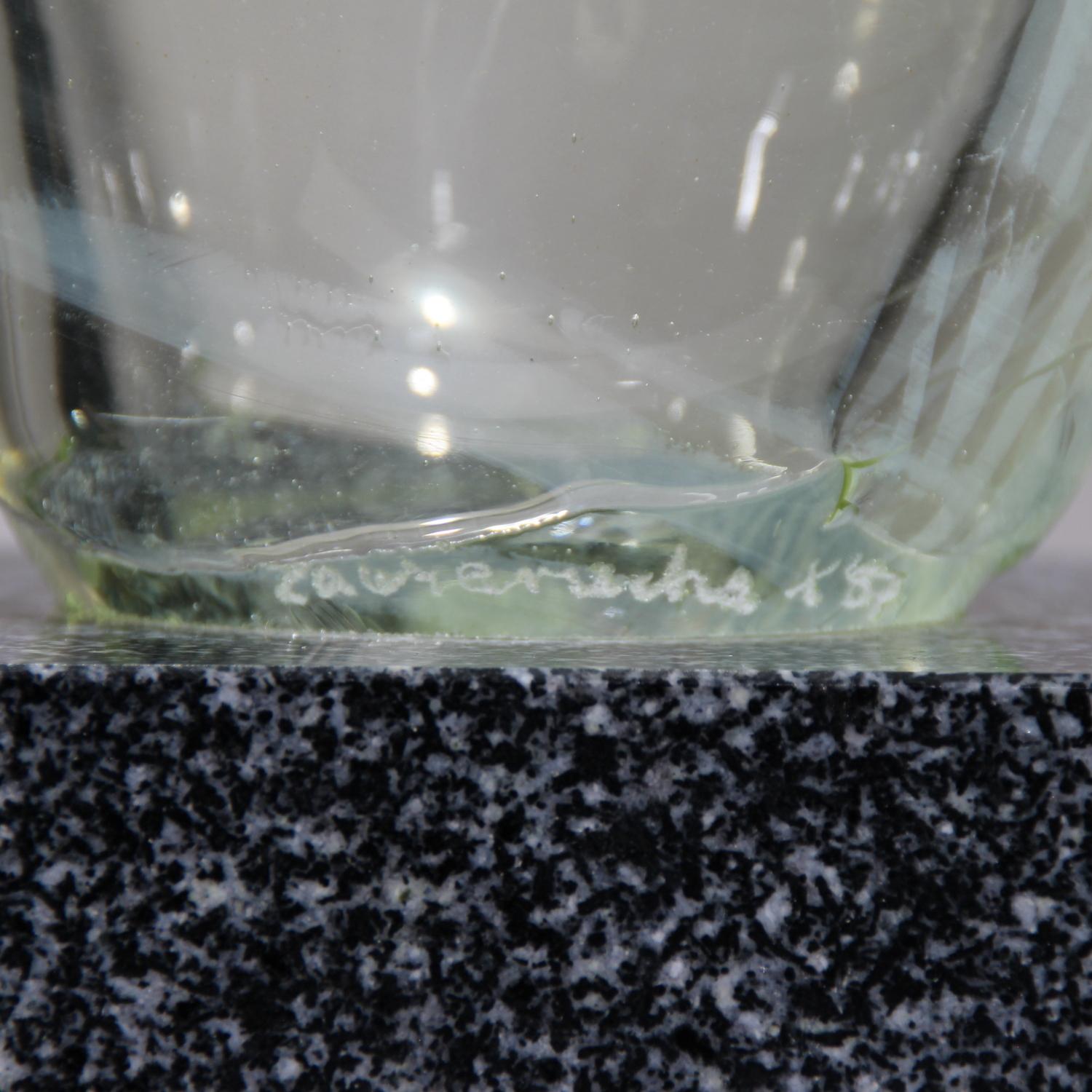 The sculpture is in very good and authentic original condition. Occasional production-related cloudiness or very fine inclusions are visible inside the solid glass body. As this is a solid, closed object, these typical manufacturing characteristics cannot be removed and serve as documentation of the manual studio production. The granite base is flawless.