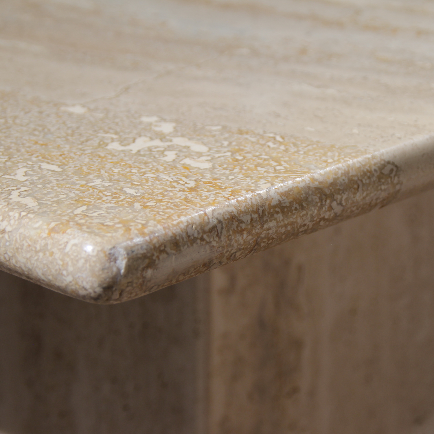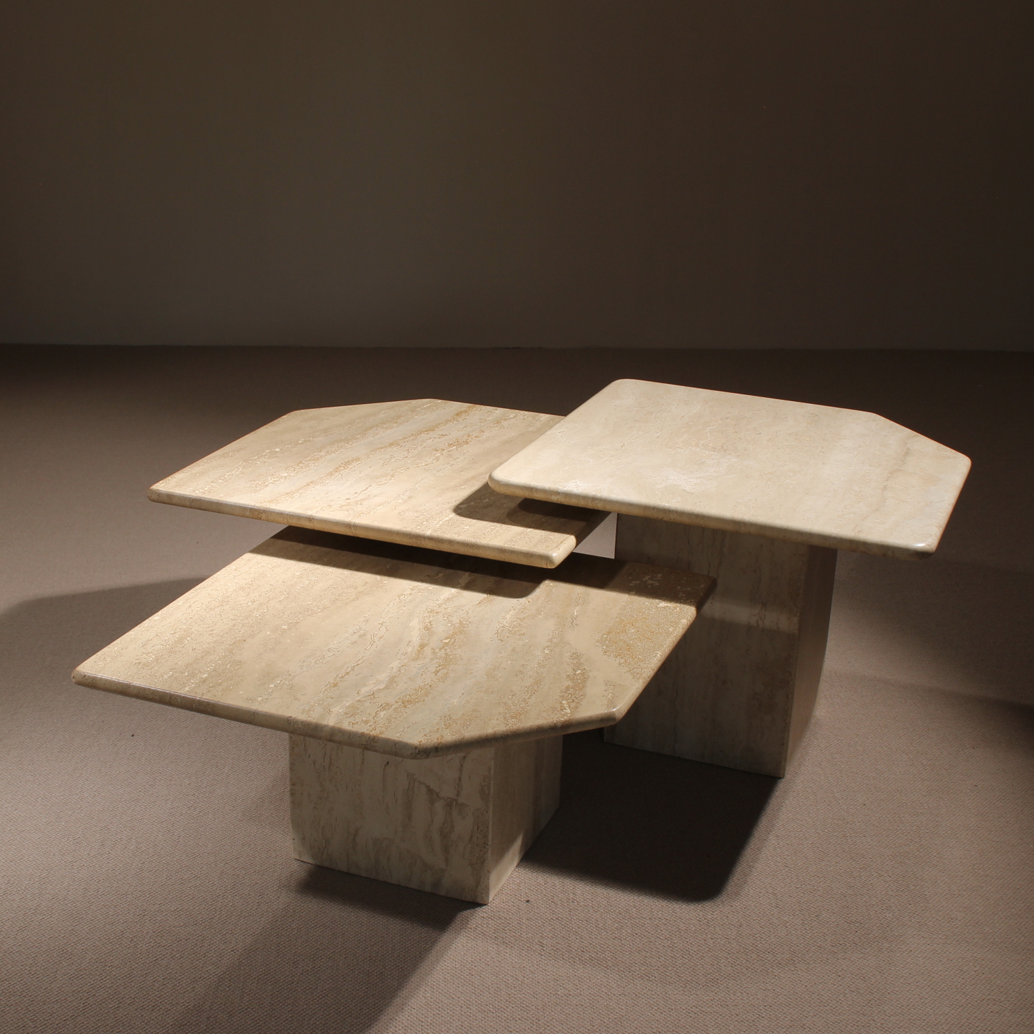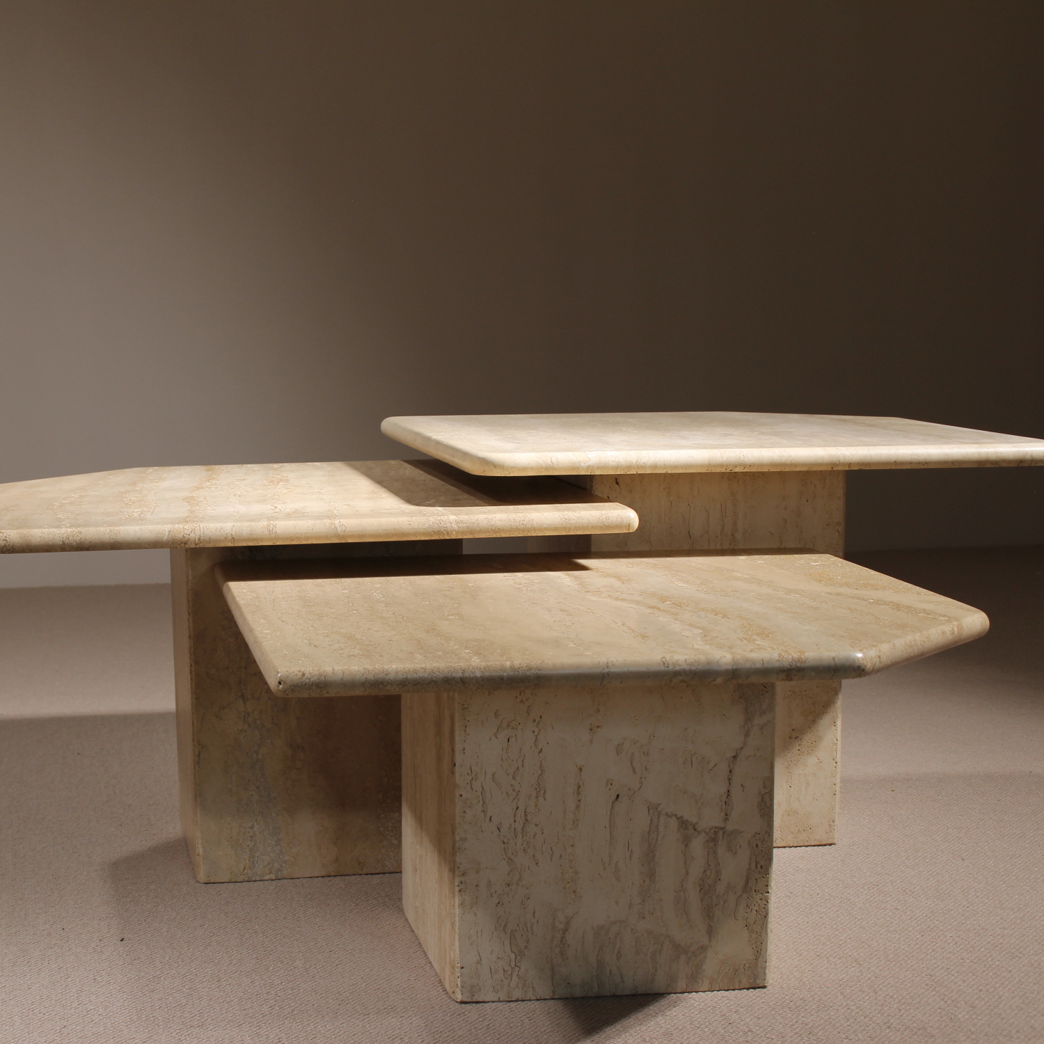 A striking set of three nesting tables crafted from solid travertine in a light, sandy hue. The minimalist 1970s design features square pedestal bases paired with asymmetrical tabletops, each notably chamfered on one corner. The tabletops are firmly attached to the column bases. Due to the natural, porous structure of the stone and the geometric styling, these tables serve as both functional furniture and sculptural objects.