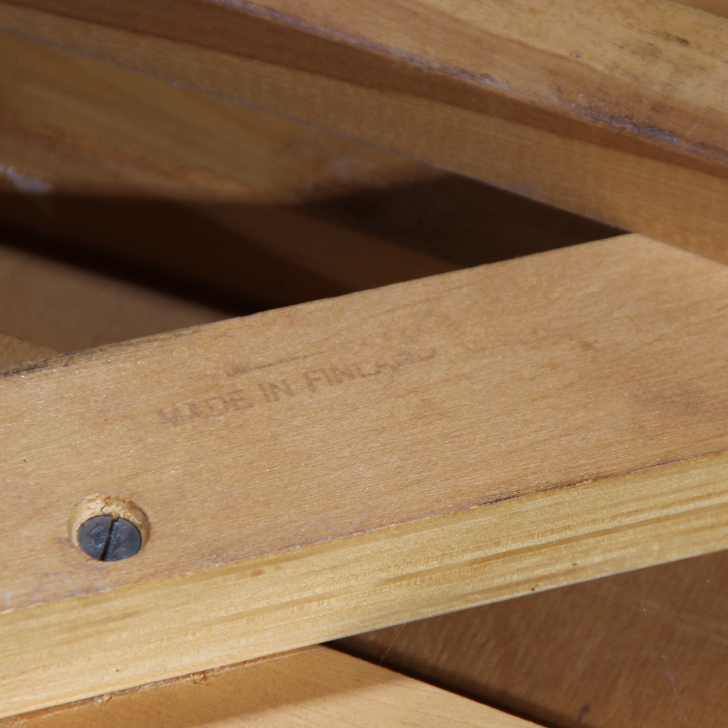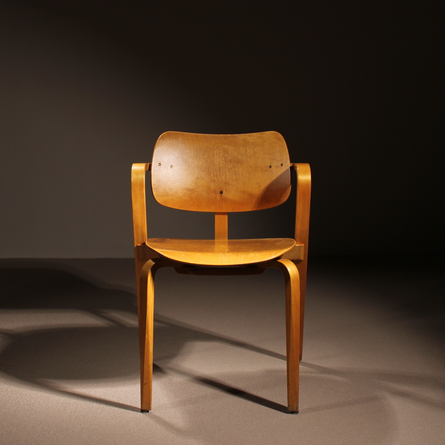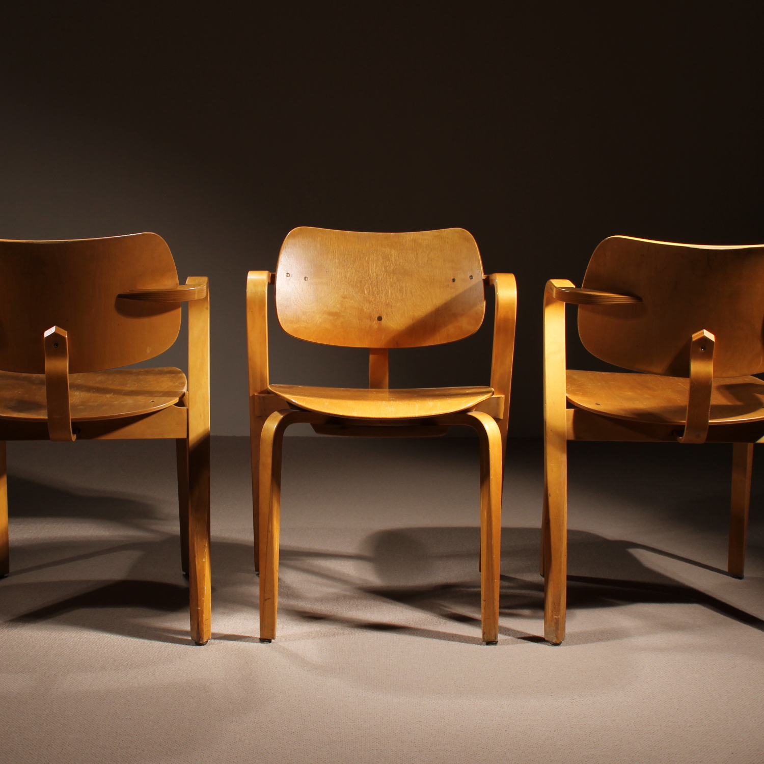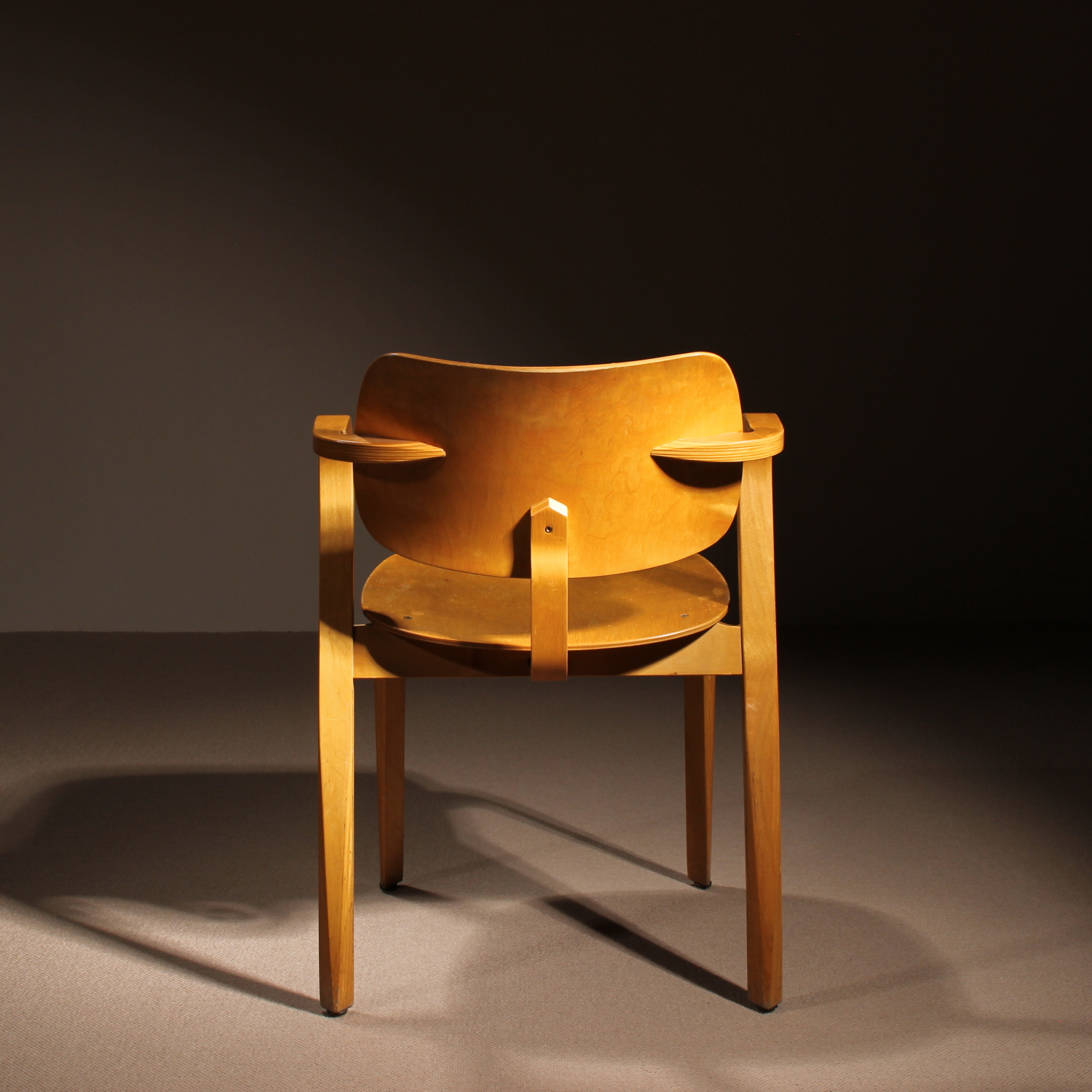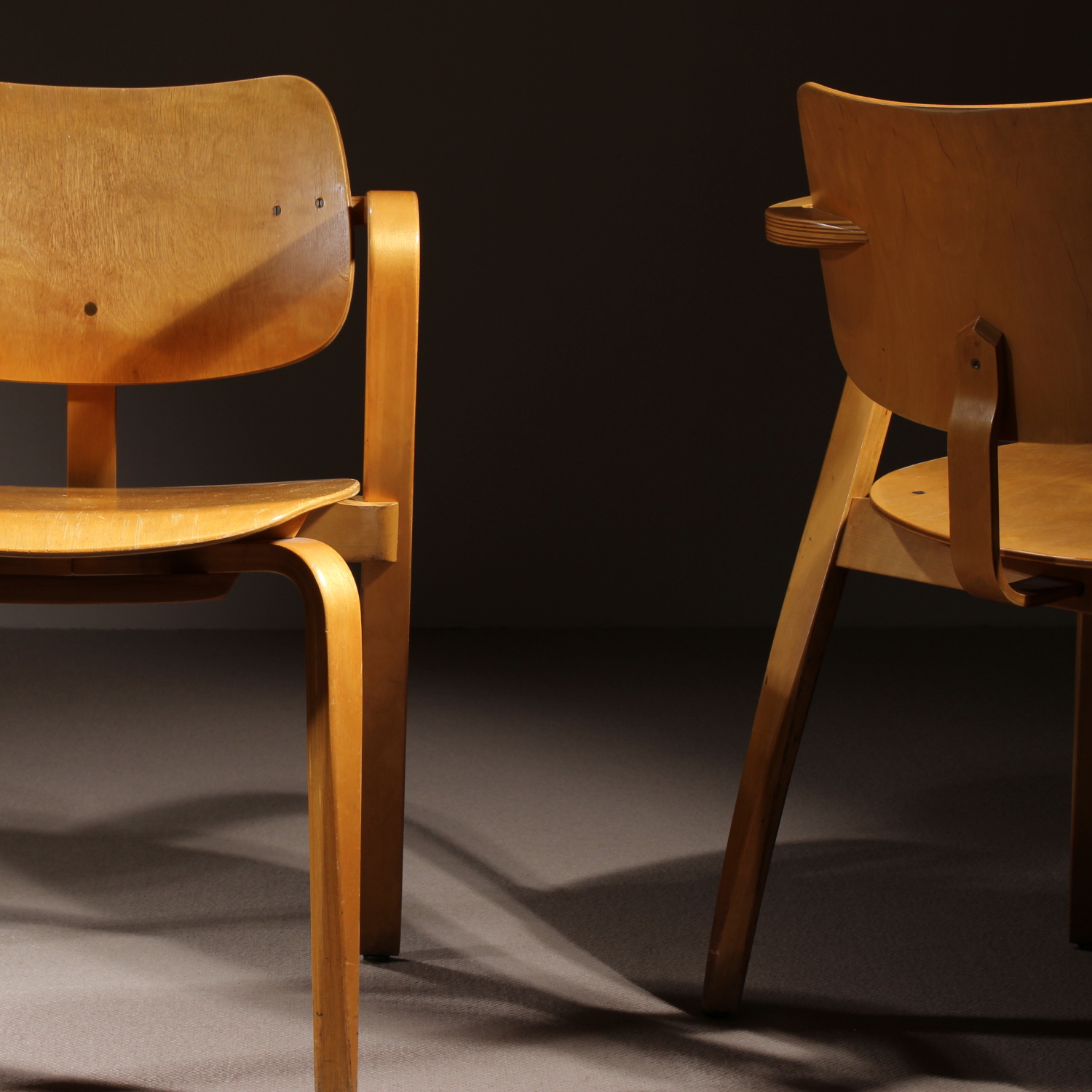 ​Designed by Ilmari Tapiovaara in 1958 and produced by the Finnish manufacturer Asko. The stackable construction is made of molded plywood with a light birch veneer. While the Aslak Chair is produced again today, this set represents rare originals from Asko’s initial production, holding significant value for collectors due to their material authenticity. These chairs originally come from the meeting room of a music school, which underlines their unique character. The partial „Made in Finland“ marking confirms early production.